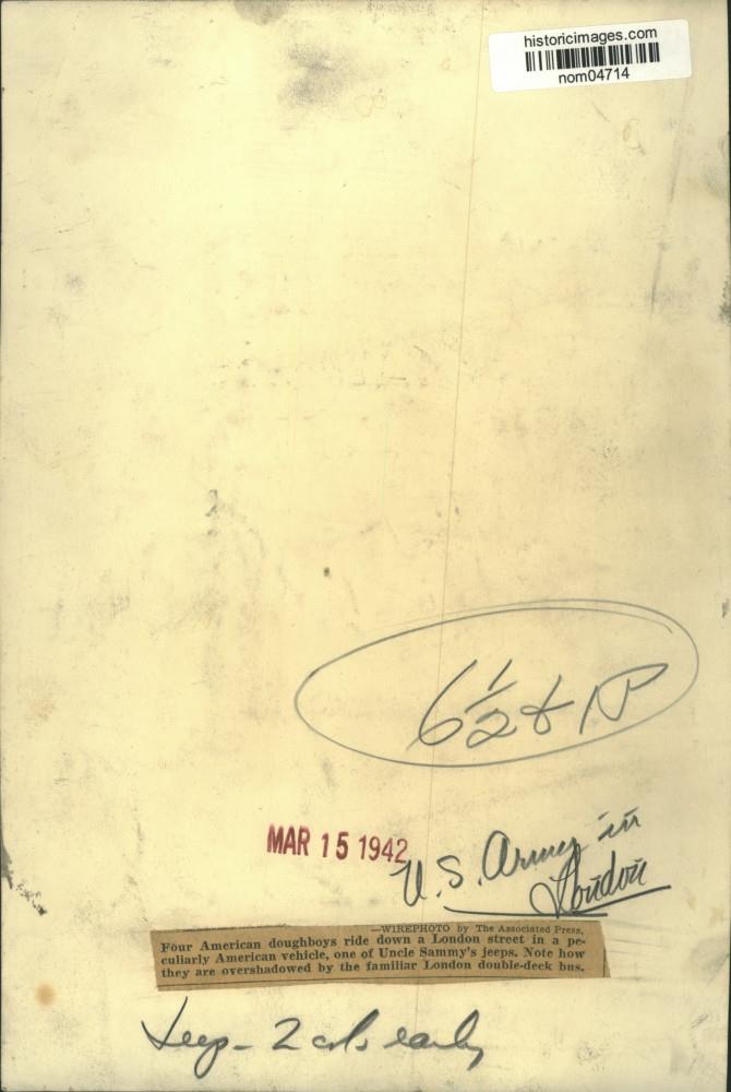 This version of the photo was auctioned in 2013 on eBay. It has the date of March 13, 1942. The caption includes the verbiage, “A ‘Jeep’ comes to London Town”.