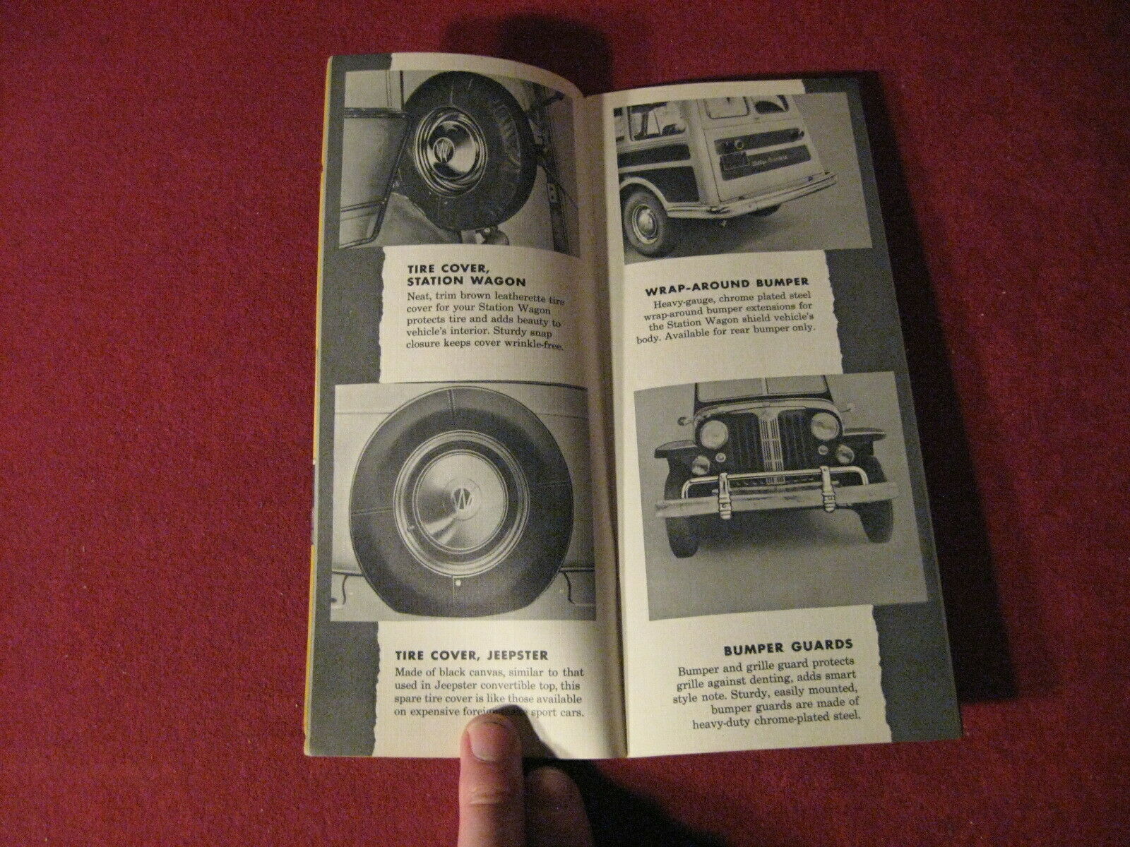 “Up tonight I have the beginning of a collection of literature I just acquired. Here I have a Genuine original 1950? Willys Sales brochure. This is about 4 by 9 and 1/4 inches with around 22 pages. Fair shape with some wear and deterioration to the covers as shown. This is a neat piece of Advertising to display with your classic. As with all my parts, if you feel it has an issue once you receive it, please contact me to have it resolved.