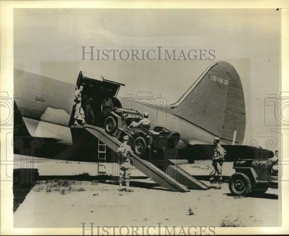 “1942 Press Photo Army Jeep Moves up Ramp of Army’s Curtiss Commando Transport. This is an original press photo.