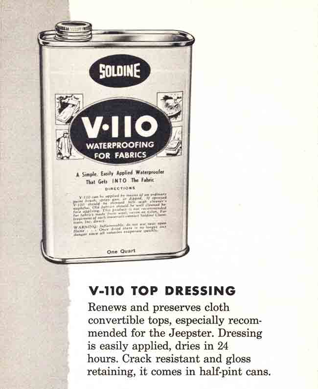 As of yesterday morning, that is where my soldine discussion ended. However, not more than two hours later, I received a 1949 Willys-Overland Accessories booklet (to be scanned and shared in full later) in the mail. On the very last page was the recommended product for protecting and waterproofing Jeepster tops: Soldine V-110 Top Dressing.