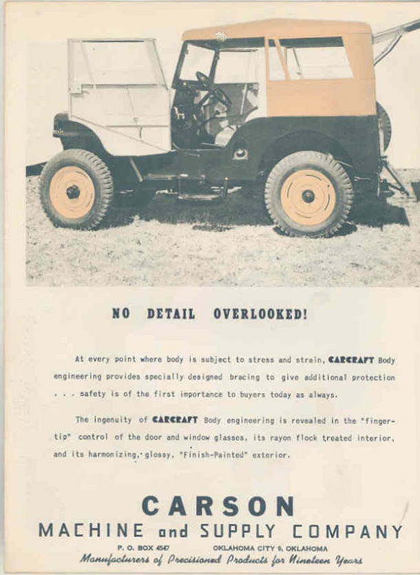 This updated post provides more info on the CARCRAFT hardtop. An early Special Equipment catalog contained two different versions of the Carson Machine & Supply Company’s Car Craft brochure. I’ve added a third brochure at the bottom which I’d found off of eBay years ago. Here are two real-world examples: one jeep and another jeep.