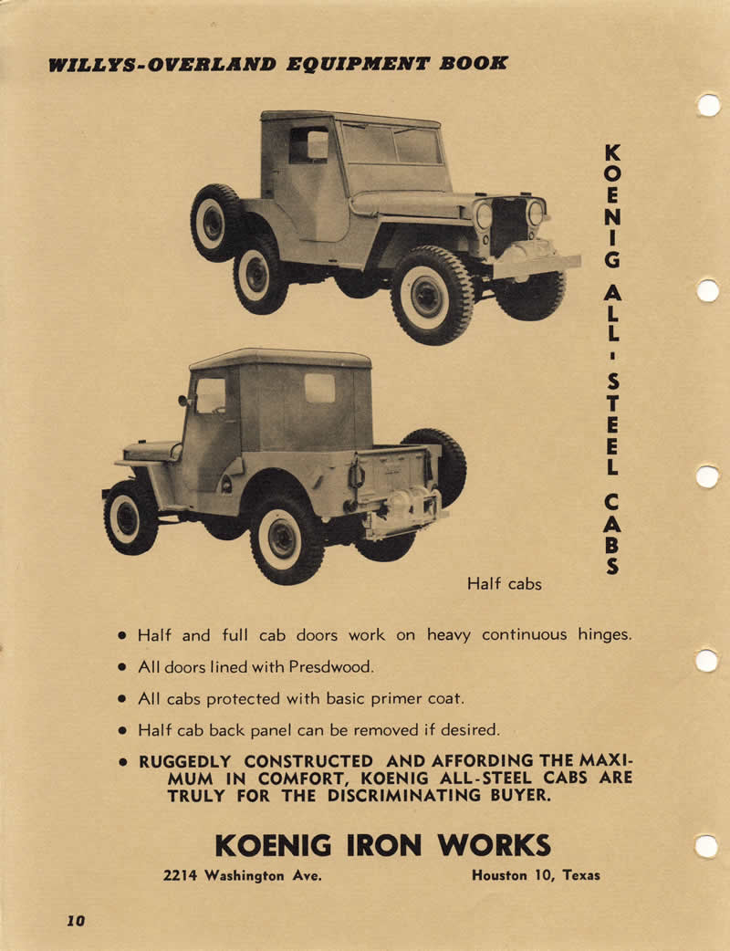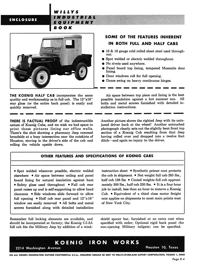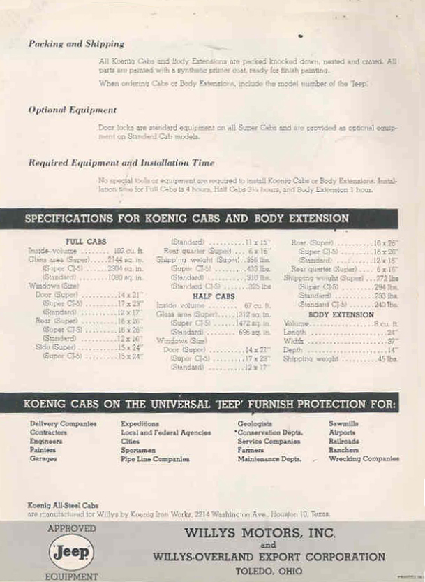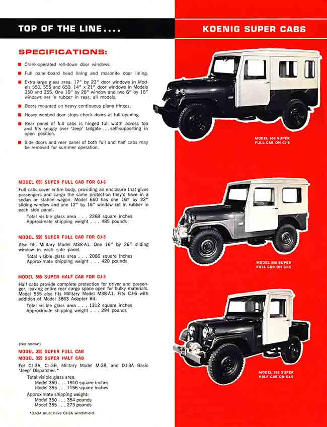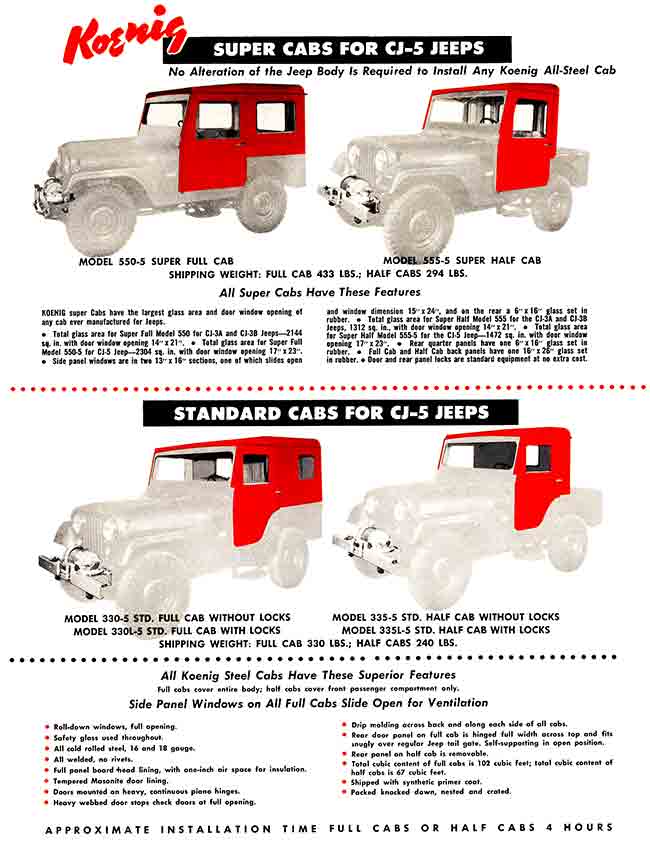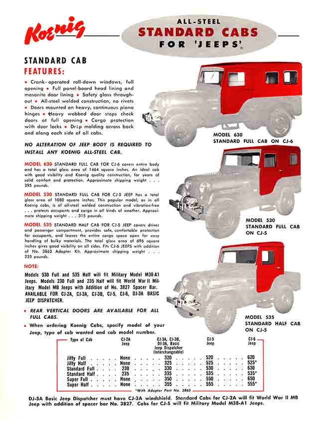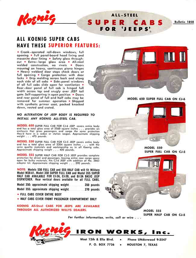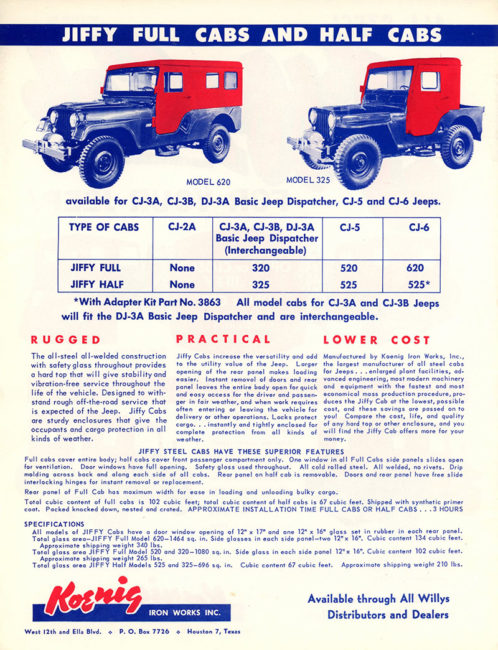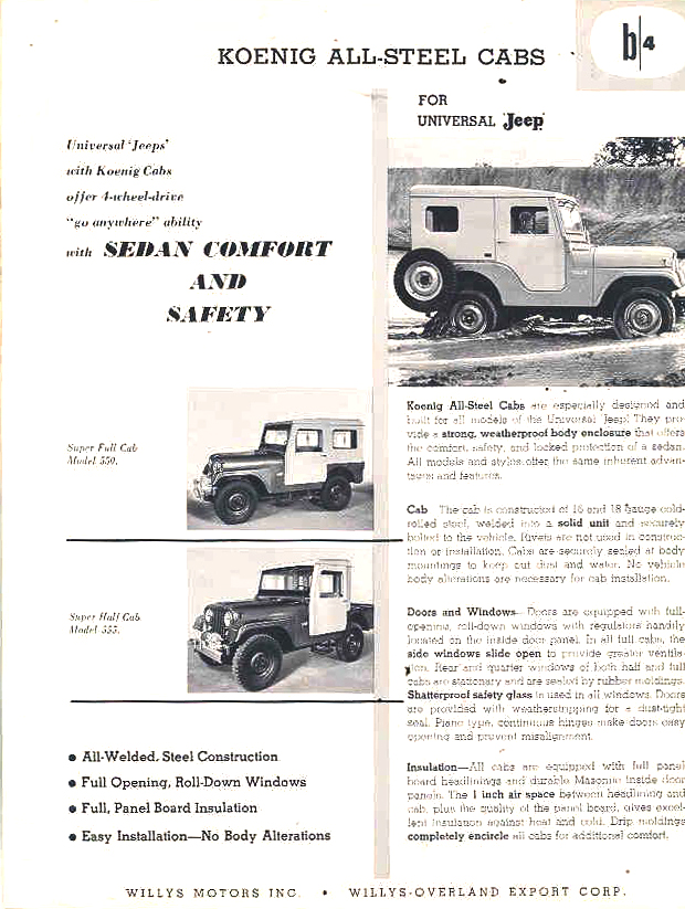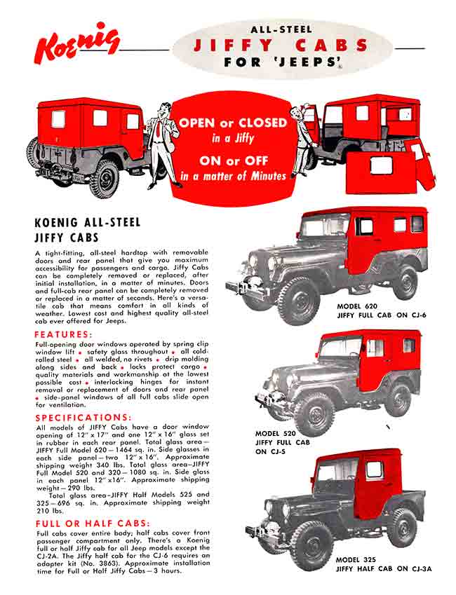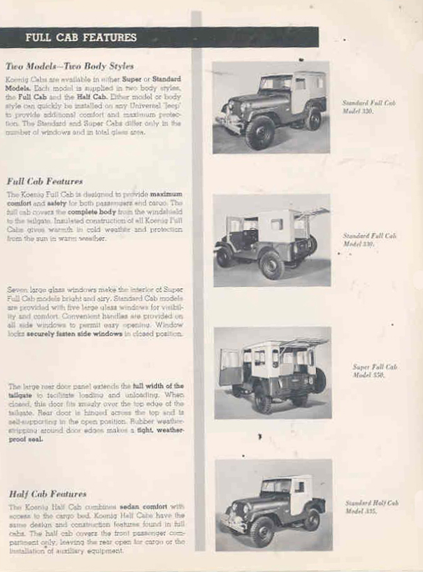 The earliest Koenig brochure I can find was published in an early Willys-Overland Equipment brochure (1949?). The models consisted of “Full Cab” and “Half Cab”. This brochure was included among a surprisingly large number of hardtop competitors’ brochures, including Worman tops, CarsonCraft tops, Boston Top tops, Sturdee tops, Porter & Reed tops, Body V7 Works tops, Blue Star tops, Lambert tops, Hills Custom Built tops and Meyers tops (which became sears tops and a company that was different from the one that produced later Meyer tops).