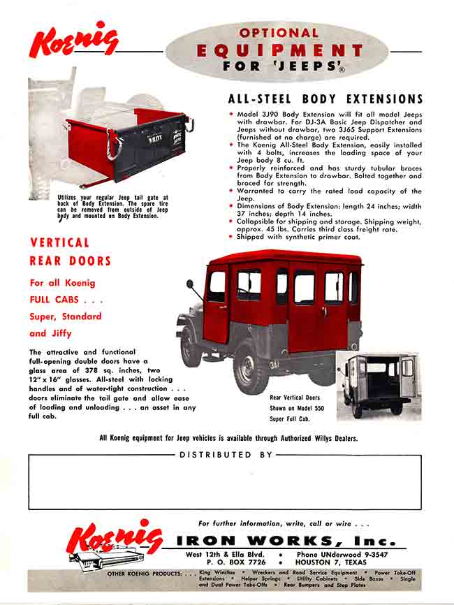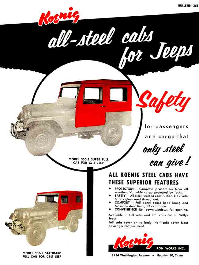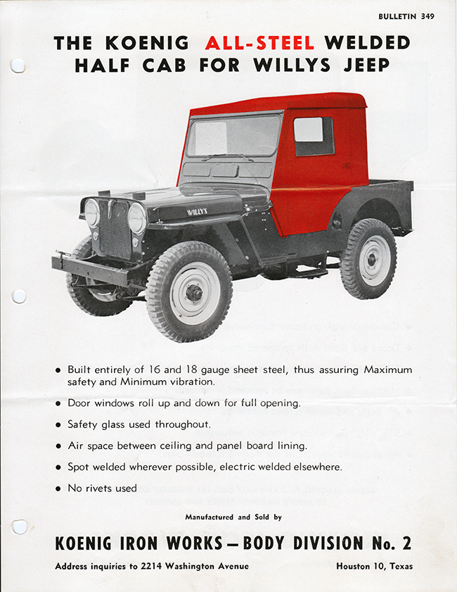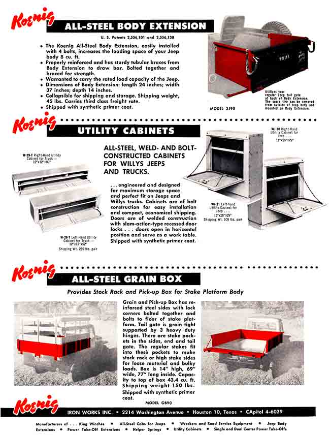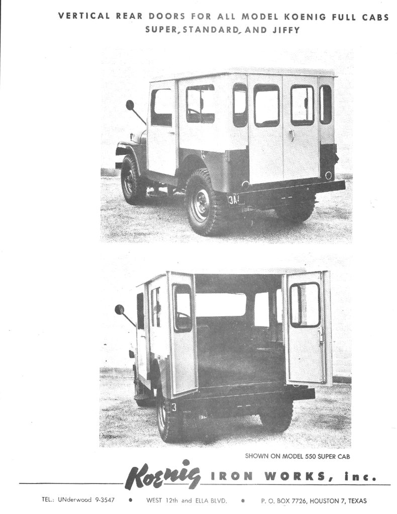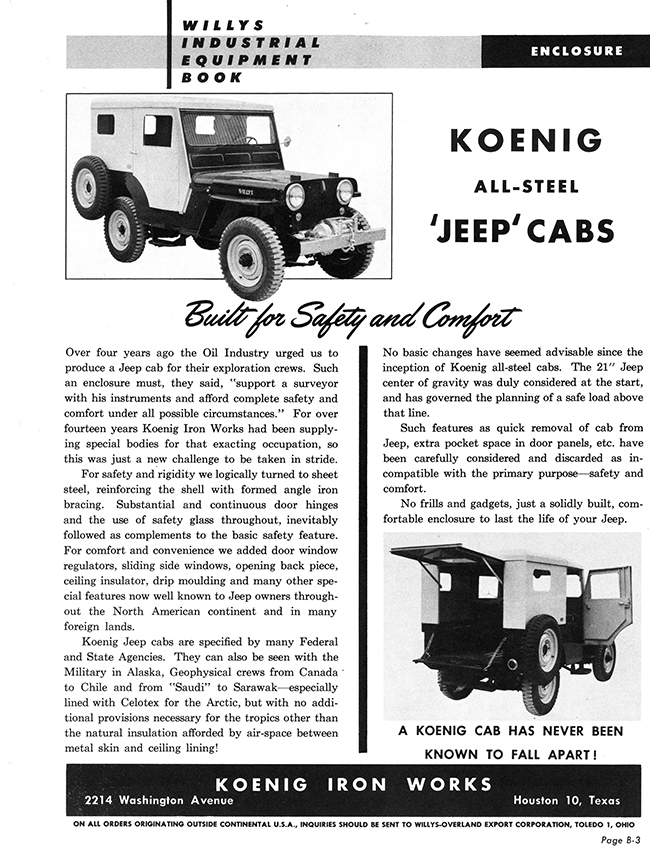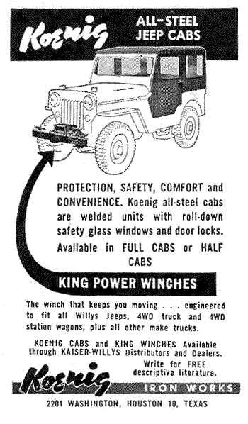“The son of the founder built the company up into a successful business making winches, “truck bodies”, and other stuff. His name was Herbert Koenig and he died in 2011 at age 95. An obit mentions that Koenig Iron Works (of Houston) was sold in 1978, and is now known as “RKI” and makes truck equipment (in Houston). They are RKI-US.com. Nothing indicates they care about Jeeps anymore!