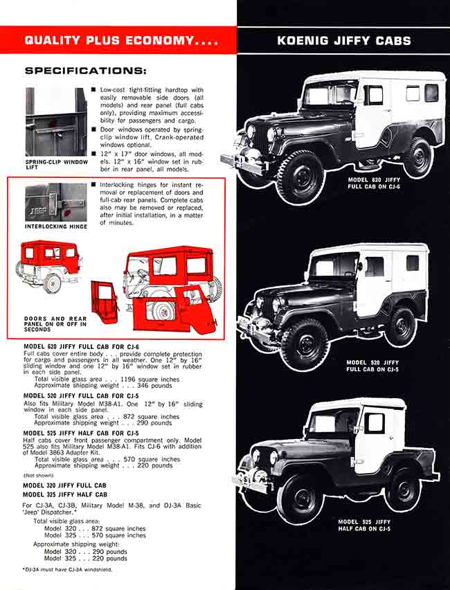 Also from the 1950s (ebay dated this brochure 1959, but I cannot confirm that date), Koenig, as I understand it, began producing hardtops for CJ-5s with doors that could be mounted by slider or by hinges (perhaps as early as 1955).