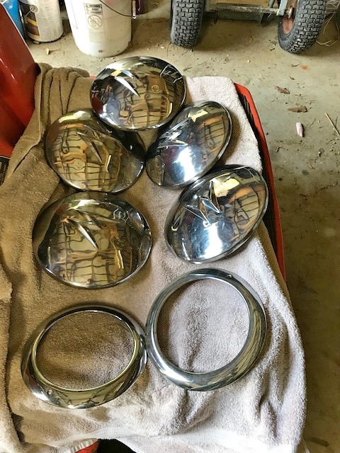 “Hub Caps and Headlight Rings for1957 Willys Jeep. Good Condition, original. $150 for all”
