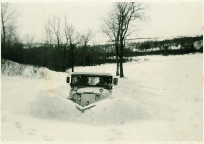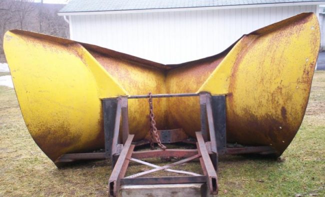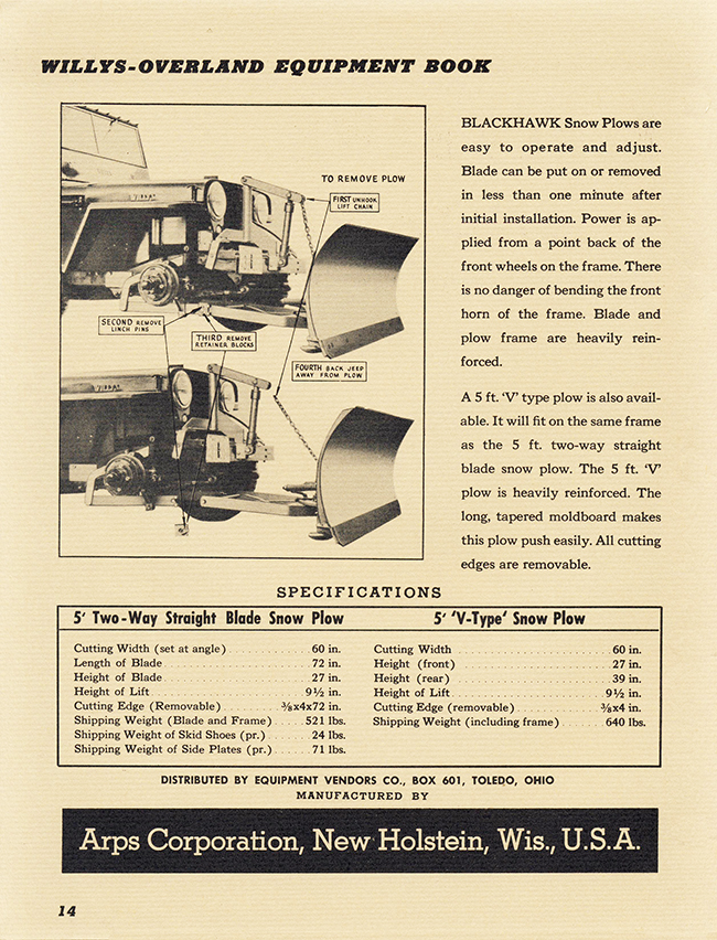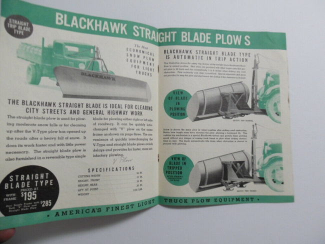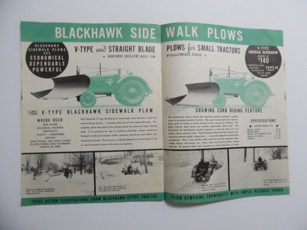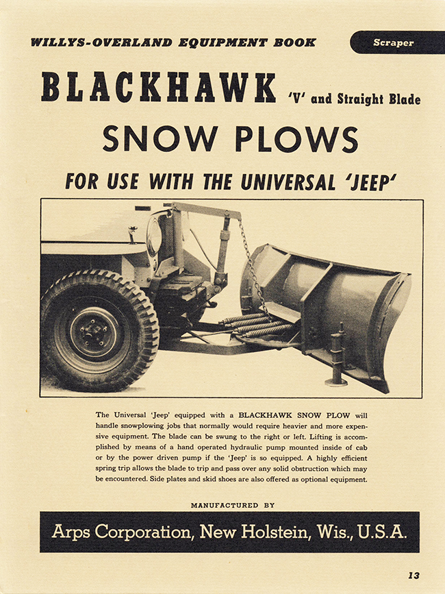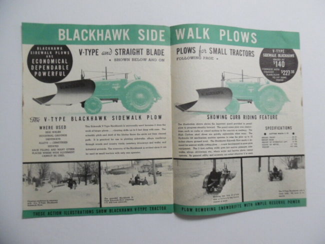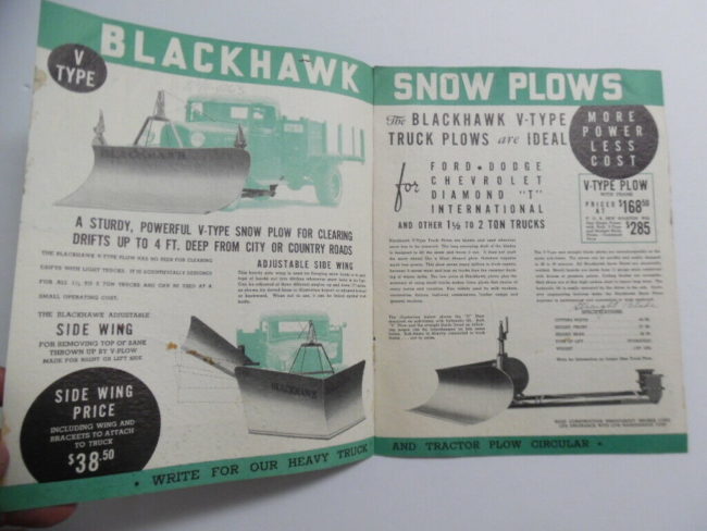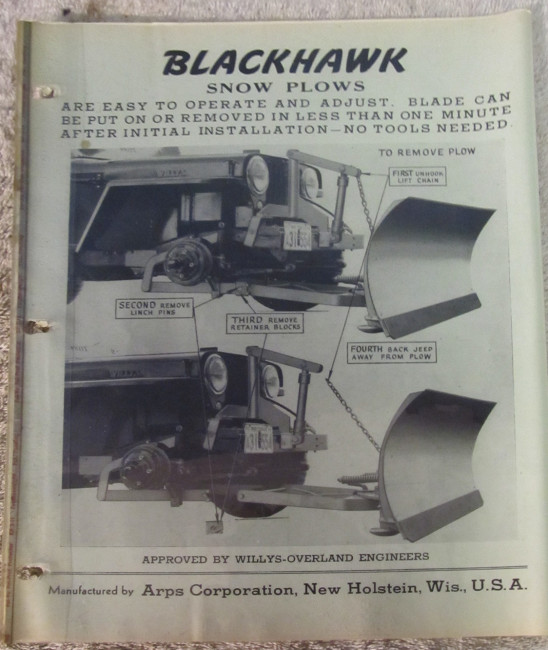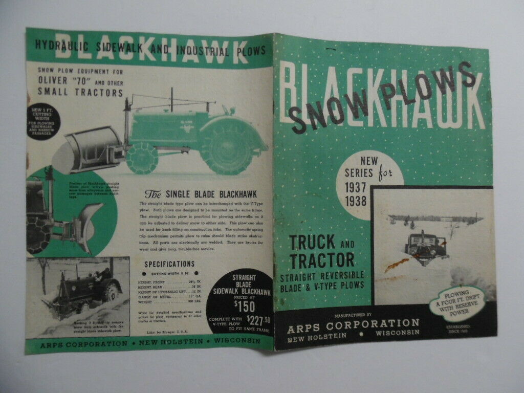 UPDATE: This post from 2013 originally consisted of a brochure from eBay, but for this update I’ve added some additional brochures and Tom’s video showing how he uses the Blackhawk snow plow in Northern Wisconsin. The Arps Corportation manufactured these plows out of New Holstein, Wisconsin. Near the end of the video he shows how he mounts the plow and manual adjusts the angle using a chain.