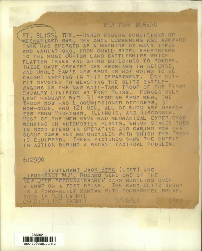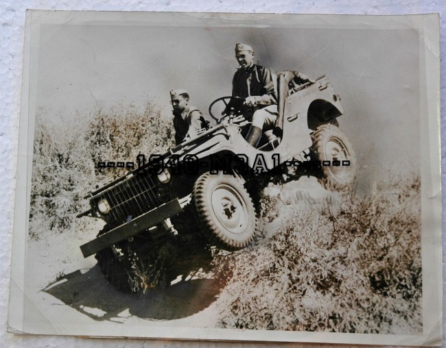 “This is an “ORIGINAL PERIOD GLOSSY PHOTO BY ACME” of THE BABY BLITZ BUGGY IS A FORD-BUILT BANTAM FOUR-WHEEL DRIVE GP JEEP WITH THE FIRST CAVALRY DIVISION AT FT. BLISS TEX., photo date – 1941. The condition is very good and measures 7″ x 9″.
