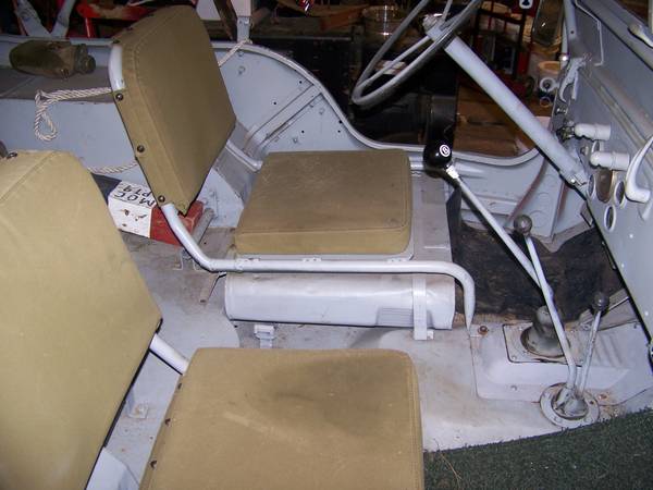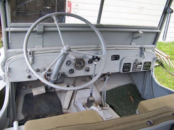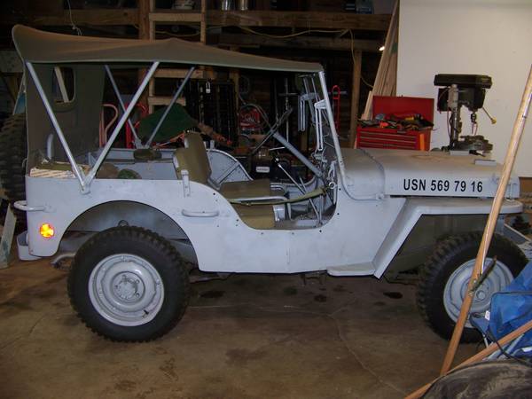 “All original WW2 Jeep. Complete and running. Includes new military non directional tires mounted on original combat rims. Includes matched spare tire also on combat rim. Top and seat covers were recently replaced (new original style). Was told engine has been recently rebuilt and probably has less than 200 miles on it. Appears to have been originally painted olive drab, but has since been painted Navy gray. Had planned on returning paint color to olive drab and purchased 1 gallon of paint which will be included in sale. Bumpers are in very good condition and very well could be originals.