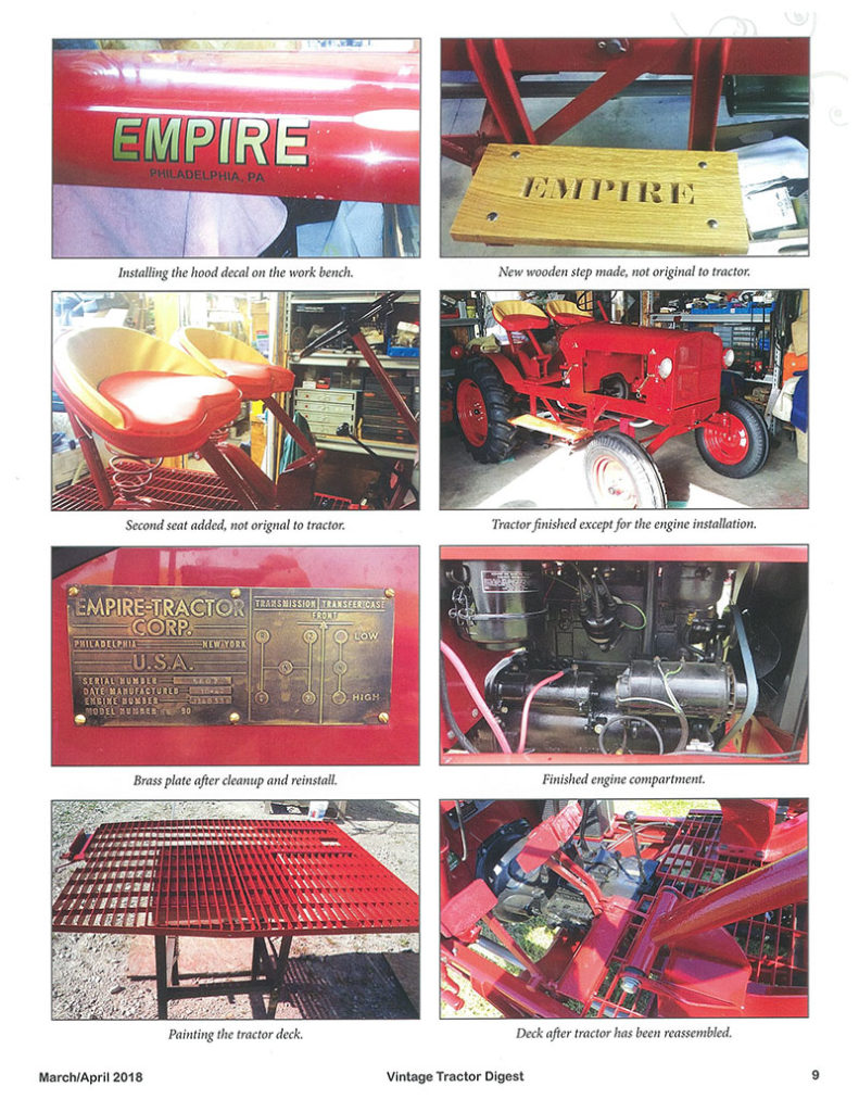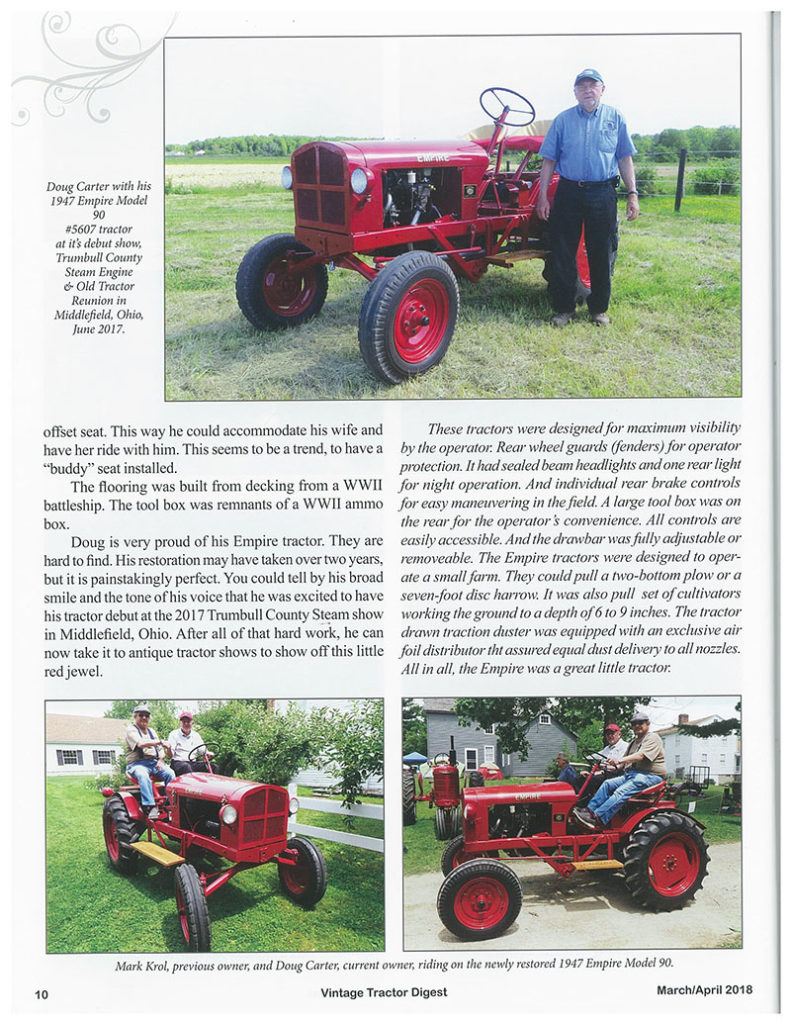 “Empire Tractor Model 90 S/N 5607 frame off restoration. The Tractor was in the Vintage Tractor Digest magazine spring 2018 plus it’s on the cover of magazine.