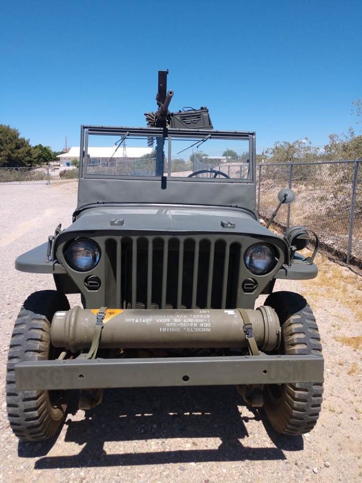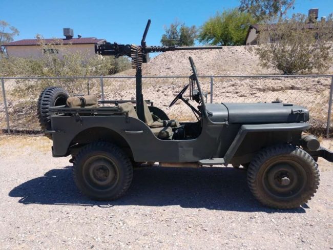 “1942 Willy’s Jeep – New tires, Rebuilt engine, Restored, 50 Caliber Replica Machine Gun, For Sale or Trade.”