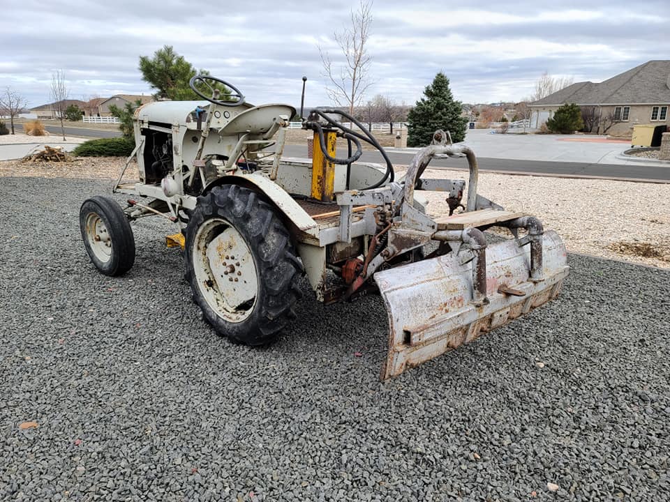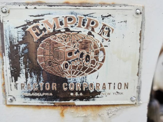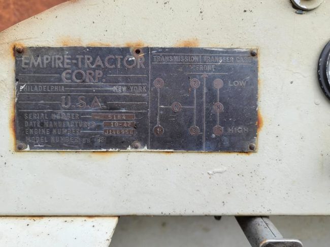 “1947 Empire tractor, s/n 5184. This tractor runs well. Tires are in good condition. We were told by seller who owned the tractor since the 1960s that the first owner had a custom haying business & the tractor kept overheating pulling a self powered bailer so he installed a McCormick Deering radiator. Sellers family built the 3 point lift & blade to clean barn stalls. Empire tractors were made with same engines, transmission, transfer case, and differential as Jeeps.”