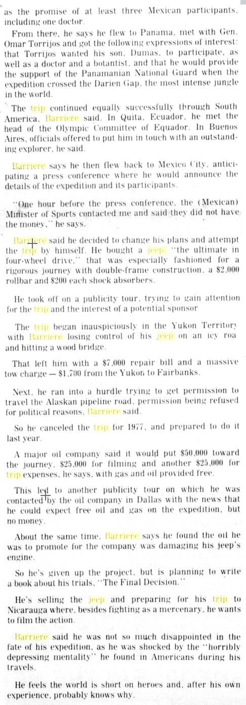 Original Post September 3, 2015: In 1978 Bill Barrier attempted to become the first solo driver to complete a Pan American Trip, Alaska to southern Argentina. This article was published in the November 11, 1978, Milwaukee Sentinel.