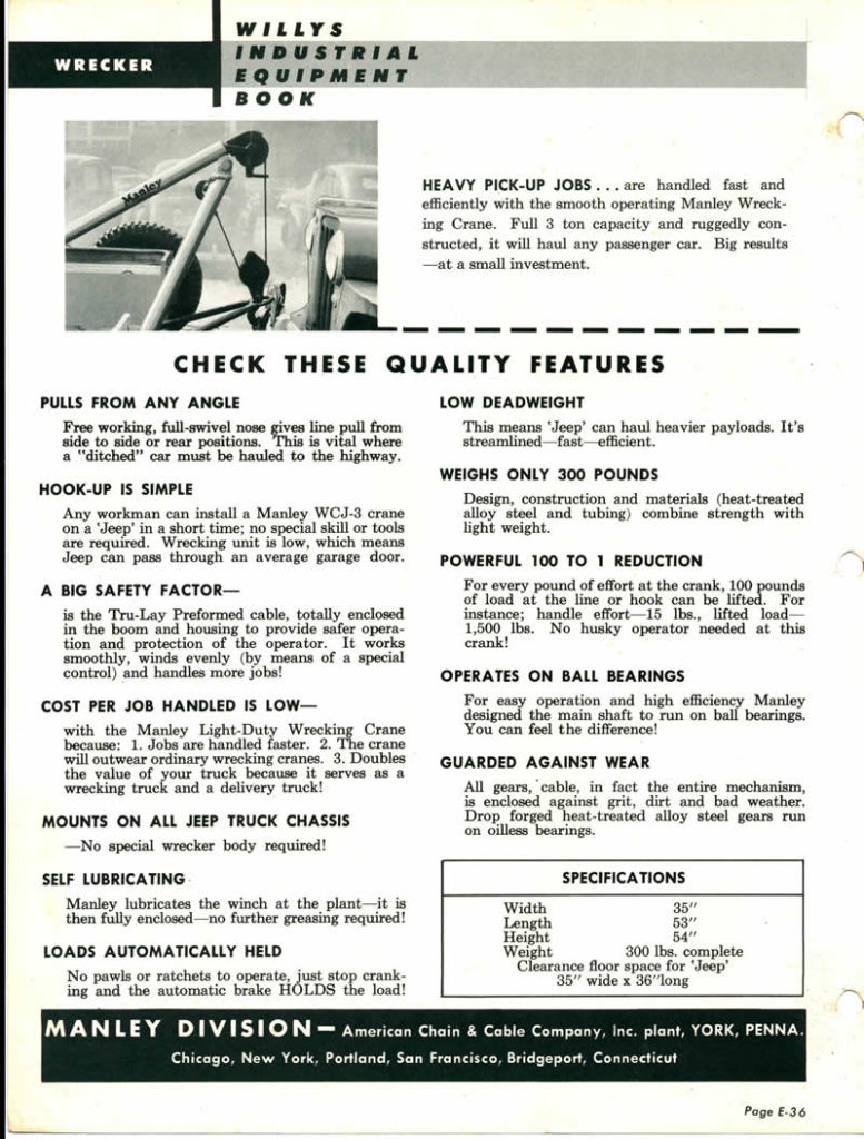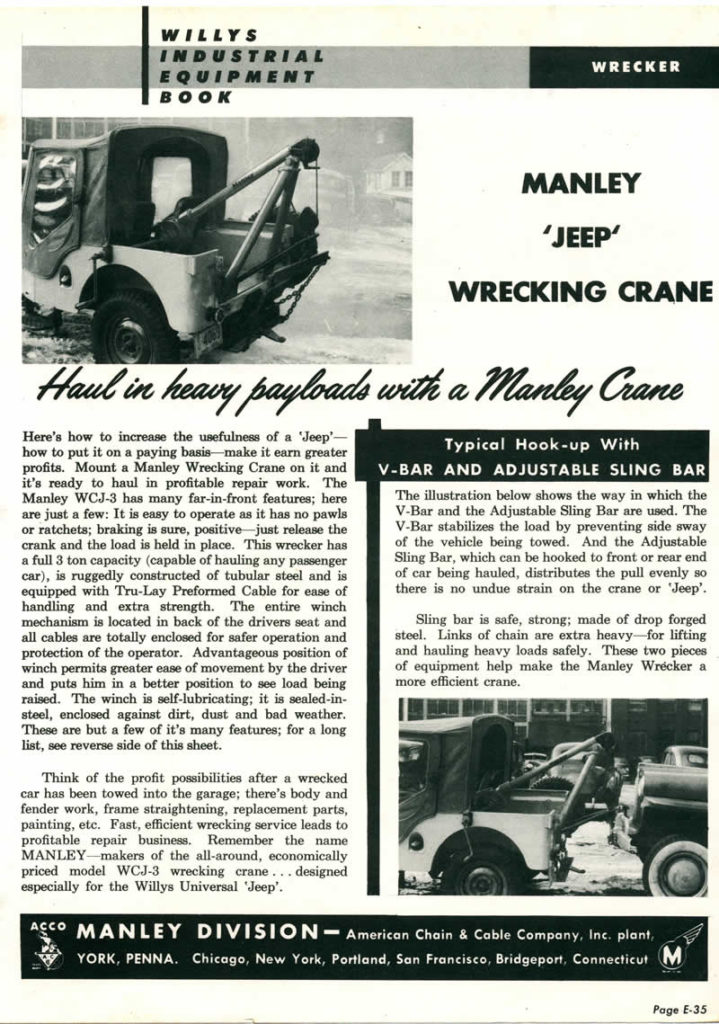 Originally published October 2016: The American Chain & Cable Company’s Manley Division produced these Jeep Wrecking Cranes in the late 1940s. I can’t imagine there are too many of these around. This brochure is from a 1948 Industrial Equipment book.