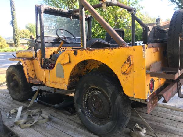 “I HAVE JUST AQUIRED A 1946 JEEP CJ2A 4X4 4CYL” 3SPEED COLUMN SHIFT” PROJECT.HAS A FLAT HEAD 4 MOTOR (THAT WAS OVERHAULED BUT LEFT PLUGS OUT) AND TRANS/TRANSFER COMBO.BEEN APART FOR YEARS,HAVE MOST PARTS AND LOTS MORE(2 OR 3 CYLINDER HEADS,EXTRA WHEELS AND TIRES ETC)THE LIST GOES ON NEW FLOOR SECTION,NEW STEERING COLUMN WITH SHIFT TUBE ATTACHED,THE LIST IS LARGE.MUST BUY COMPLETE IN OTHERS WORDS COMPLETE NO PARTING”