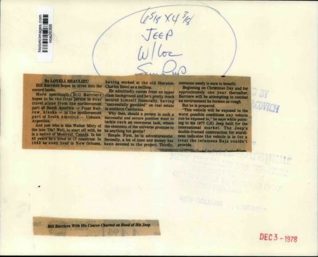 Original Post January of 2019 …. UPDATE: Another photo of Bill Barriere and his jeep appeared on eBay (see below). That find sent me once again on the pursuit of the question, “What happened to Bill Barriere’s jeep trip?”. It turns out, he didn’t make it very far. During the early portion of his trip, he crashed into a bridge in the Yukon, which left him with a $7000 repair bill and $1700 tow bill (Yukon to Fairbanks). He decided to abandon the trip idea and, instead, become a mercenary fighter in Nicaragua (and drive his jeep there). Maybe some day I’ll figure out how his life as a mercenary fighter panned out.
