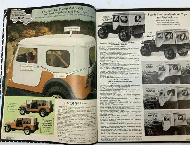 UPDATE: This model of top was also sold under the Sears brand. This 1977 catalog shows the top, but doesn’t indicate it was manufactured by Kelly. I’d assume that the different shaped door in the catalog pic has to do with that vehicle being a CJ-7.