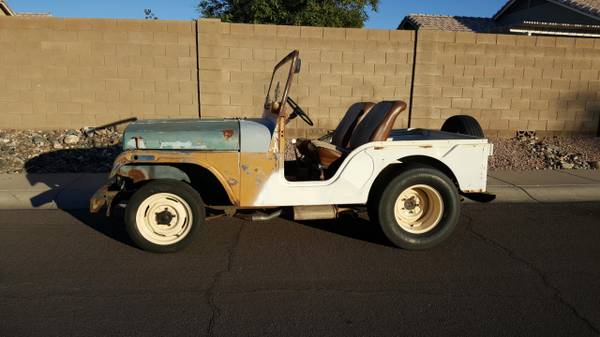 “Well… Its kind of a Jeep stew. A little postal, a little Commando, a little Willys CJ5 and kind of a Jeep Rod. It started off as a DJ5A postal dispatcher. Still has the original drivetrain. Chevy II 135cu 4cyl and powerglide transmission. Still right hand drive. Manual drum brakes. Runs good but would be better with a SBC which would bolt right in.”