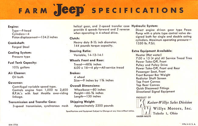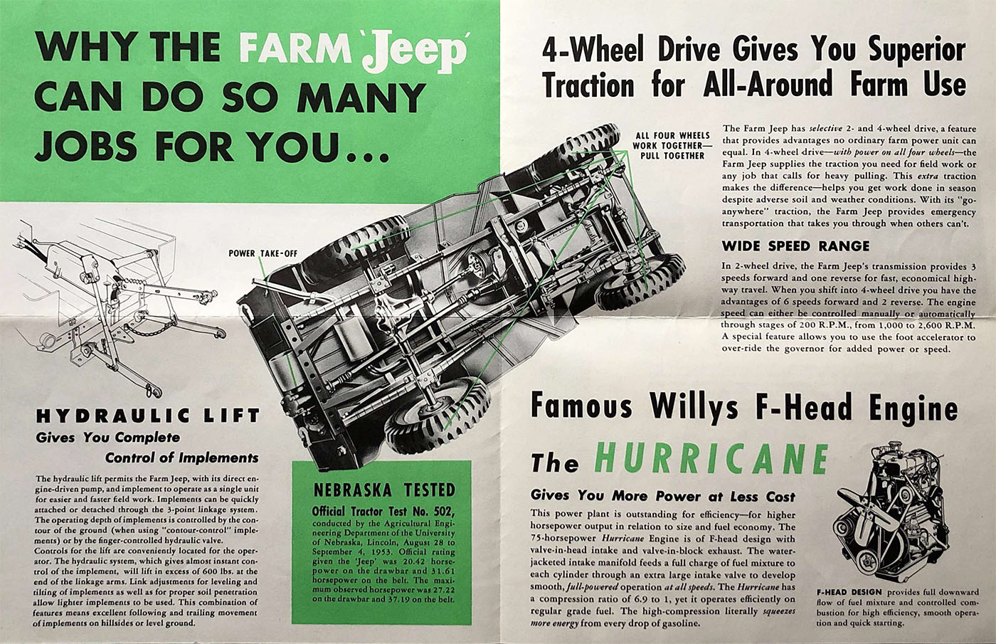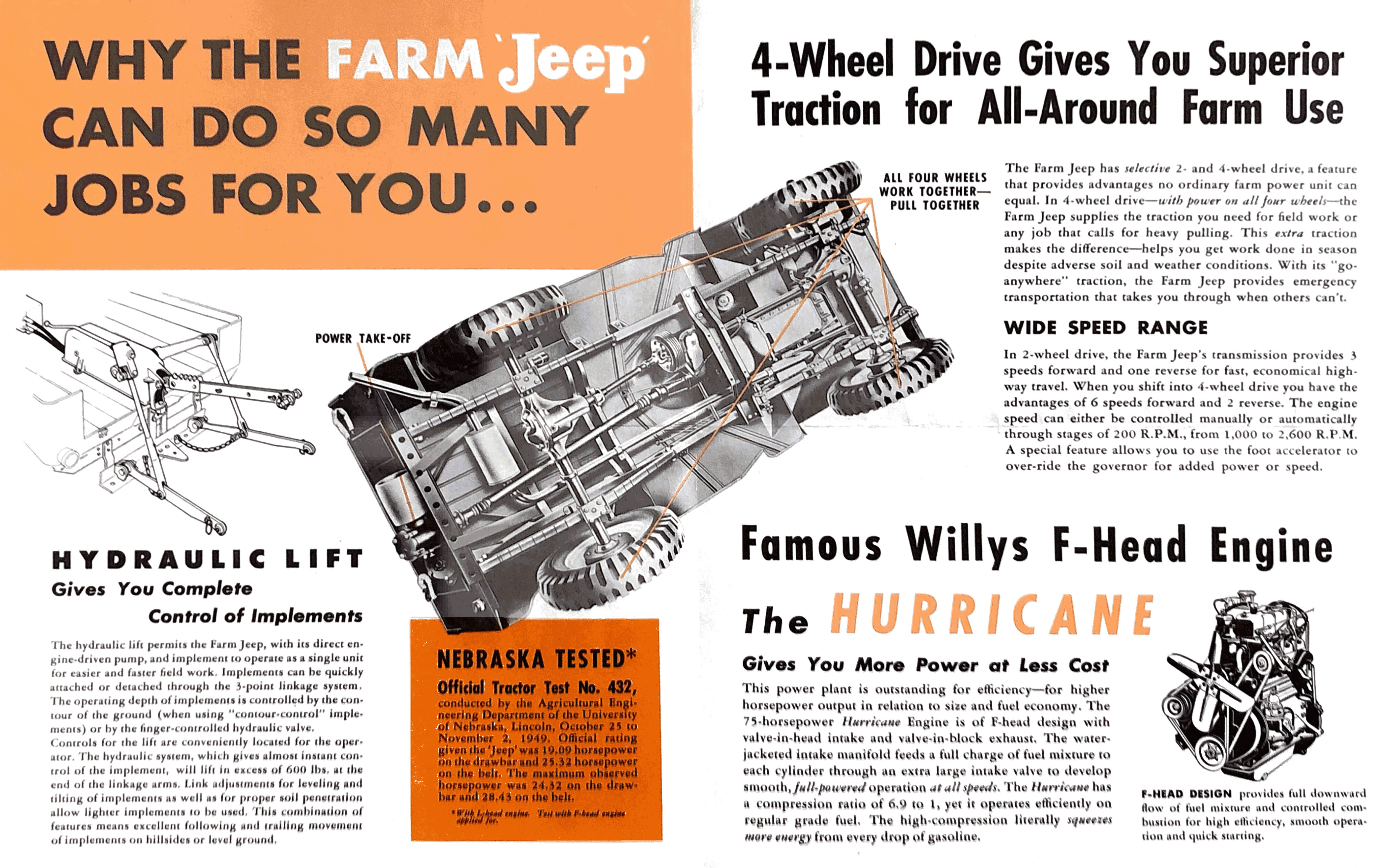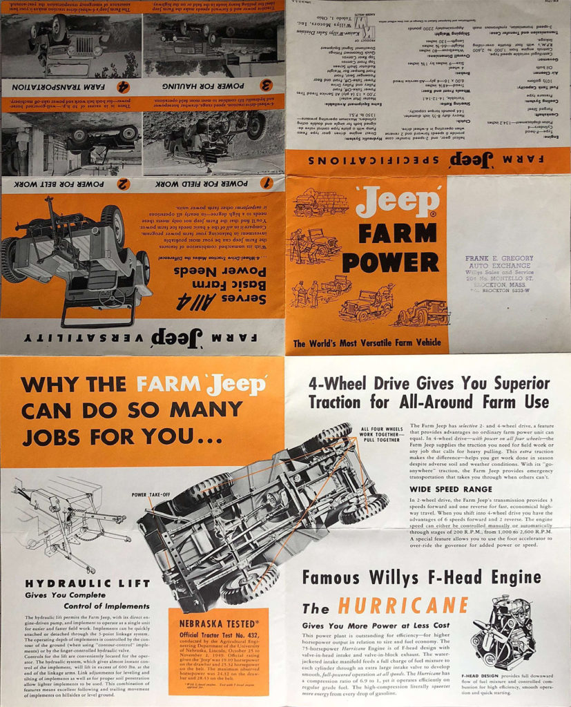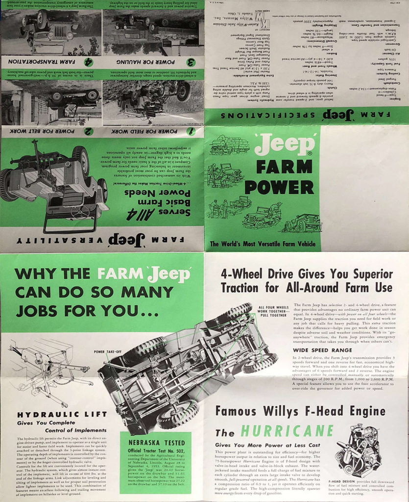 A small section on both brochures is titled “NEBRASKA TESTED”. Apparently, when the original orange brochure was produced, the jeep had only completed a tractor test (#432) using a jeep powered with an L-head, yet the company had applied to take the test using an f-head. At some point after the brochure was published, the f-head test (#502) was completed (which did show increased horsepower).