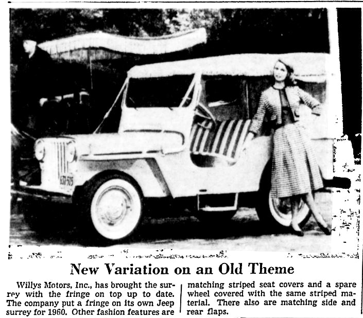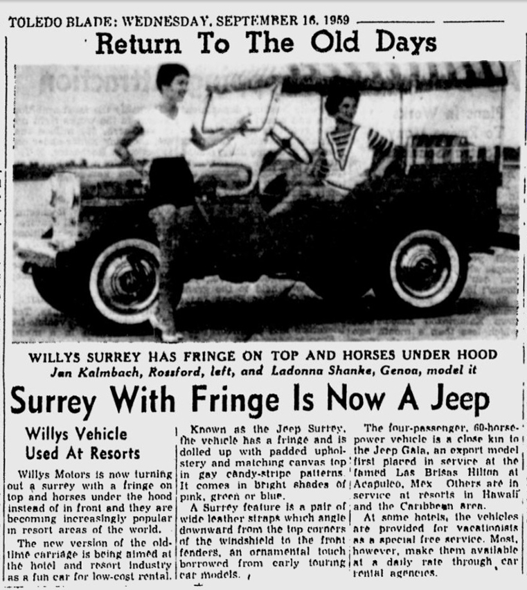 Two months earlier a September 16, 1959, article in the Toledo Blade welcomed the ‘Jeep Surrey’ as well.