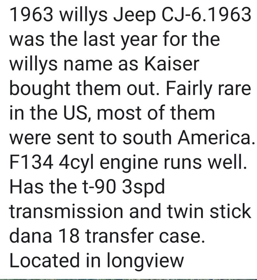 “1963 Jeep CJ, runs good, 4×4, bikini top, 4cyl,”