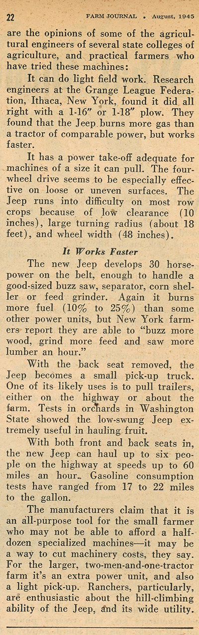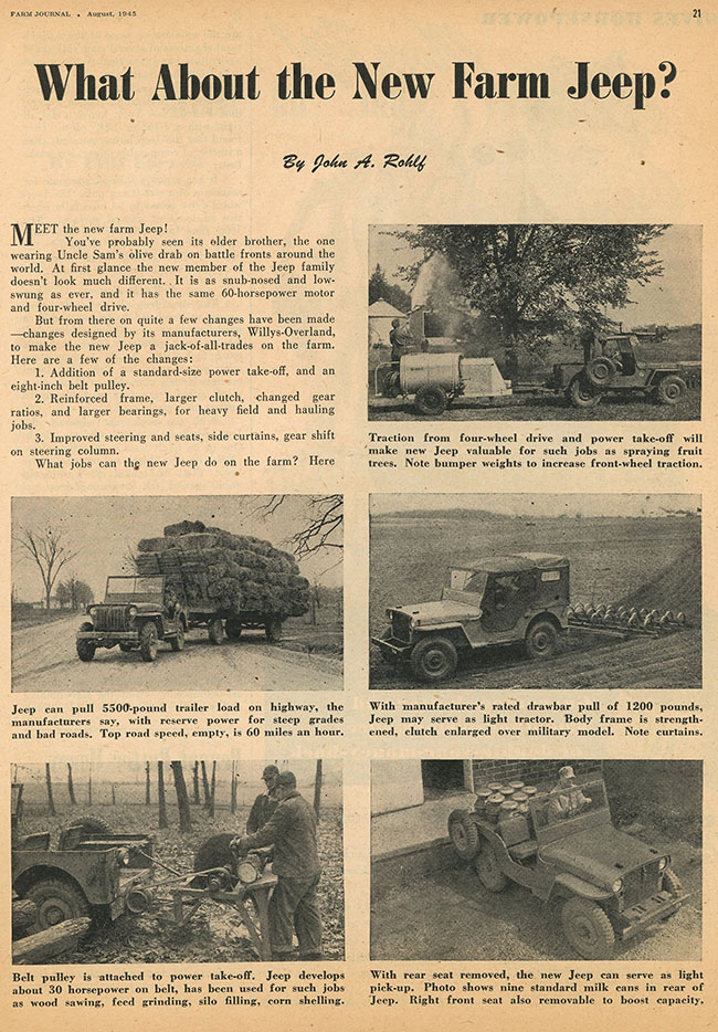Very interesting article. It is mostly Willy’s supplied data (and photos), but also contains some criticisms from early engineering testing. The difficulty with with field crops because of low clearance and turning radius and increased fuel consumption comments wouldn’t have pleased the marketing department.