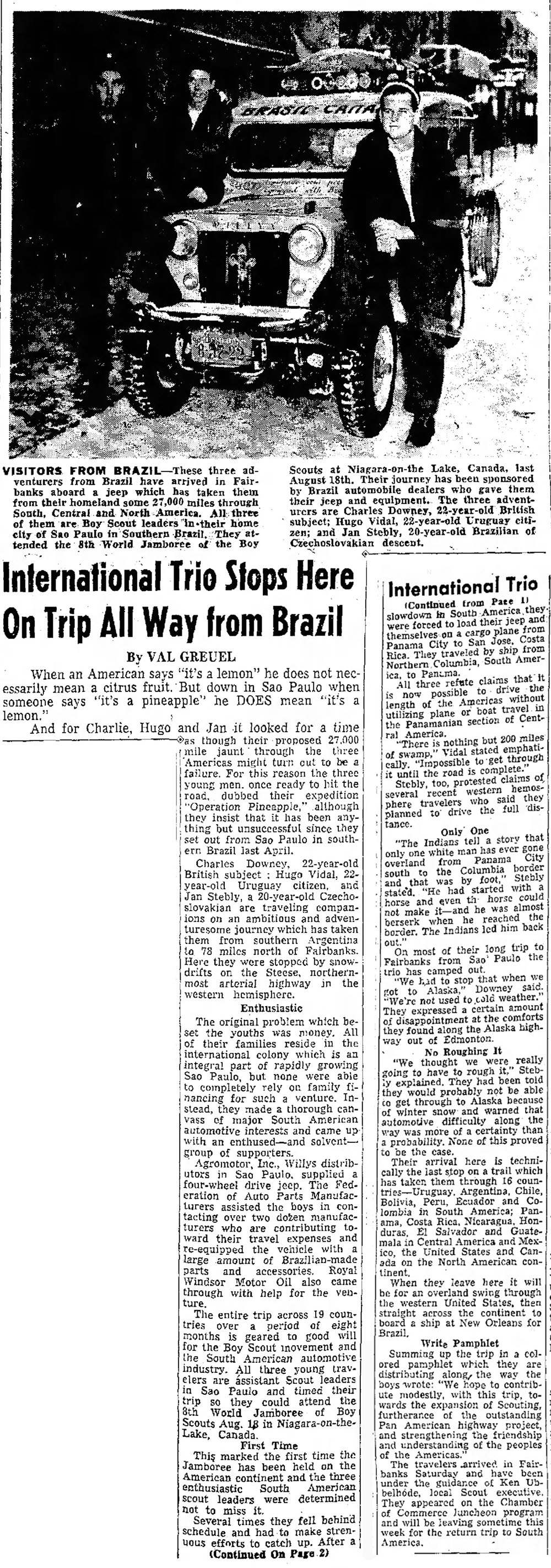 Most folks are already familiar with this trip, but I wanted to add these news reports to the database of Operation Pineapple information. One of the articles noted that the three travelers did not try an American hamburger, because hamburger was fed to dogs in Brazil.