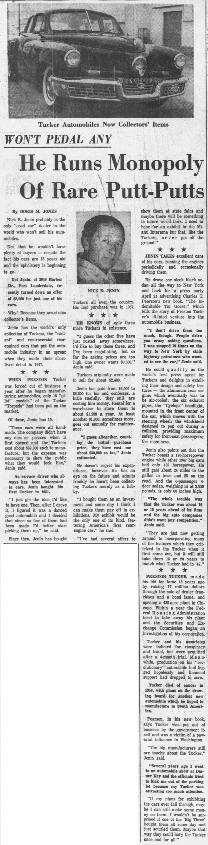 In 1960, The Miami News ran a story on Jenin’s collection. In it, Jenin seemed to think that only 18 pilot models of the Tucker ever produced, which rightly would have convinced him that his collection was ever more impressive (or maybe I’m confused by his statement).