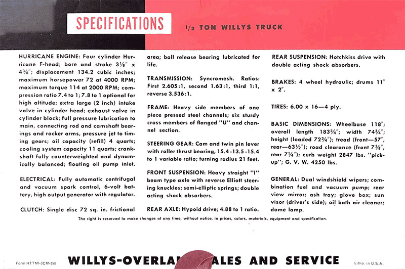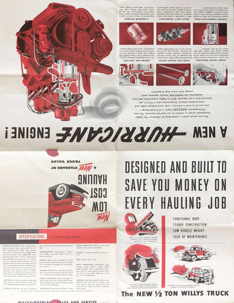 This is one of the introductory brochures for the new 1/2 ton truck powered by the new Hurricane engine. It’s Form HTTMI-3CM-350, a form number I’ve yet to decode for any meaning. This folds out to roughly 11″x17″. Here’s another one of these on eBay at a good starting price.