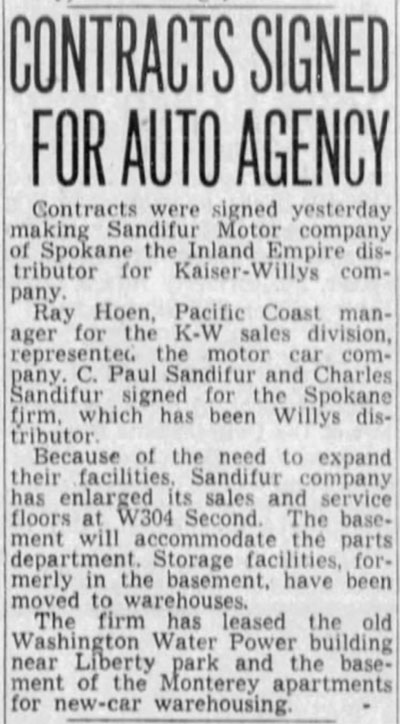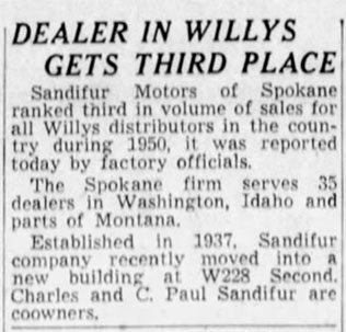 The Sandifurs became a Willys distributor in the autumn of 1945 soon after the launch of the CJ-2A. An ad in the October 21, 1945, issue of the Spokesman Review confirms this.