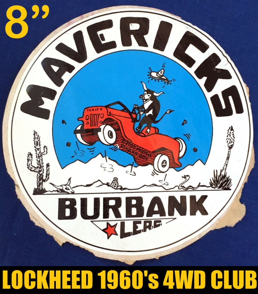 • One (1) VINTAGE ORIGINAL “MAVERICKS” FOUR WHEEL DRIVE CLUB 8″ VEHICLE EMBLEM STICKER from the Lockheed Employees’ Recreational Club (L.E.R.C.) in Burbank, CA circa 1968. Never used. Still has it’s original kraft paper backing (for peel-&-stick) in very nice condition.