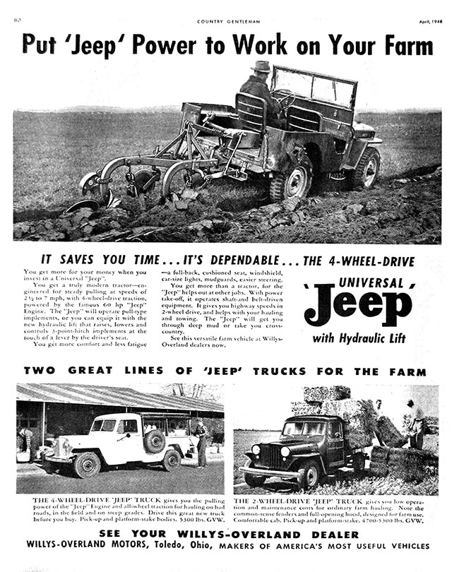 This April 1948 “Put Jeep Power to Work on Your Farm” advertisement appeared in the Country Gentleman magazine. It also appeared in the May 1948 issue of the Farm Journal.