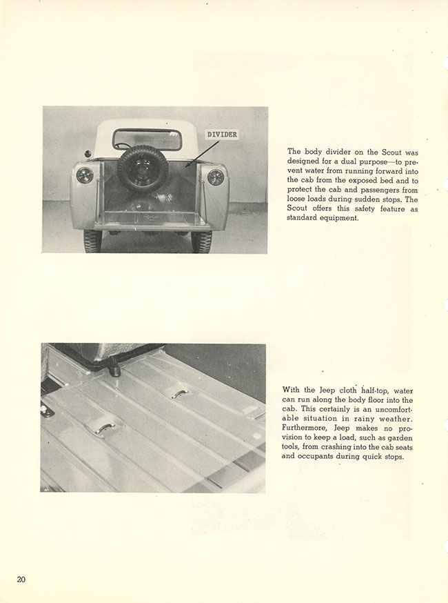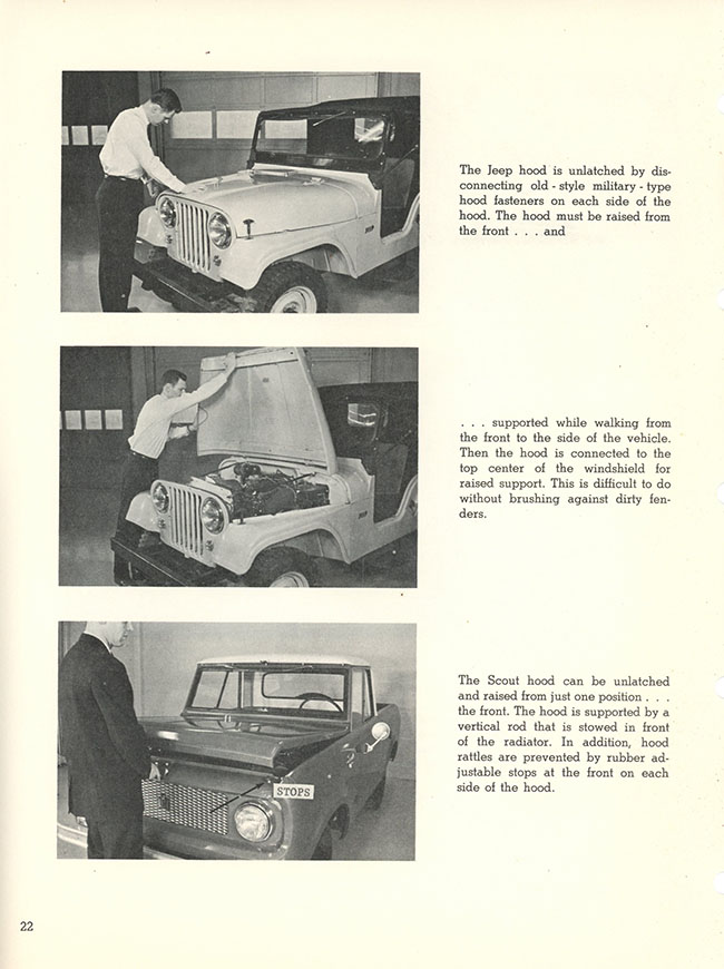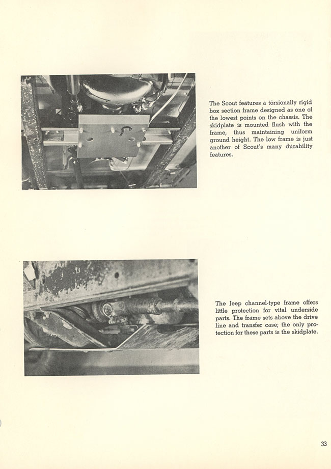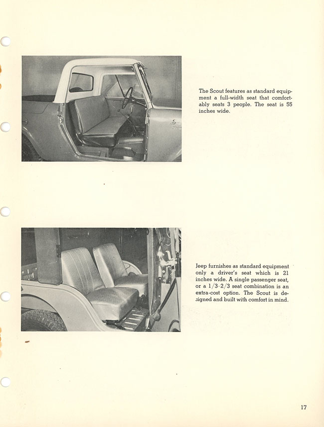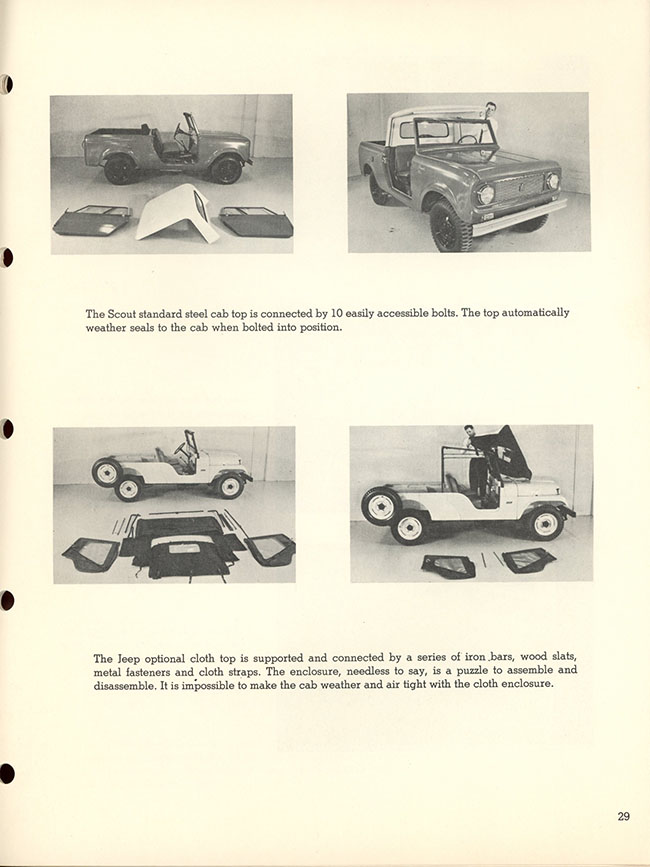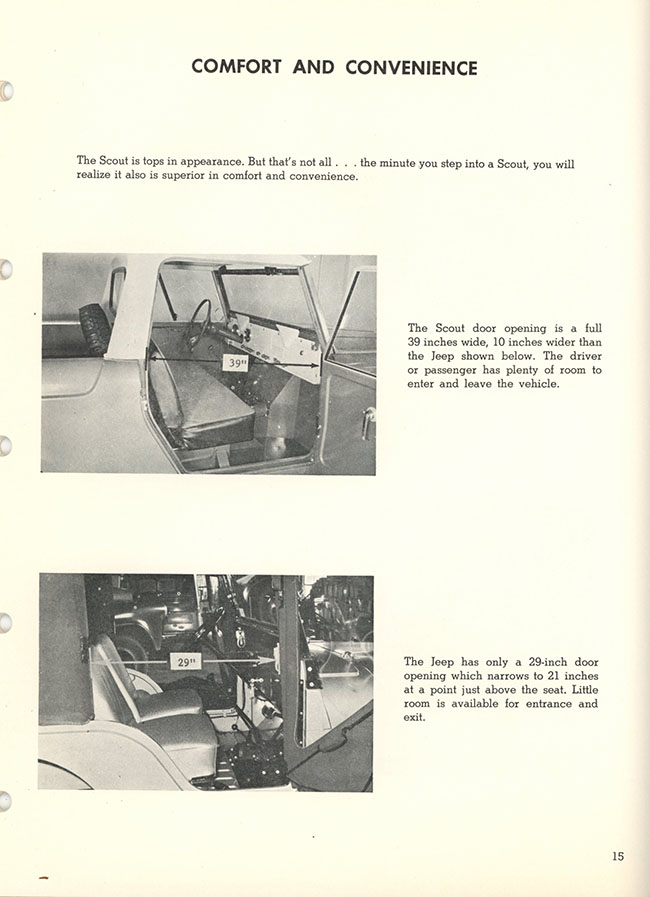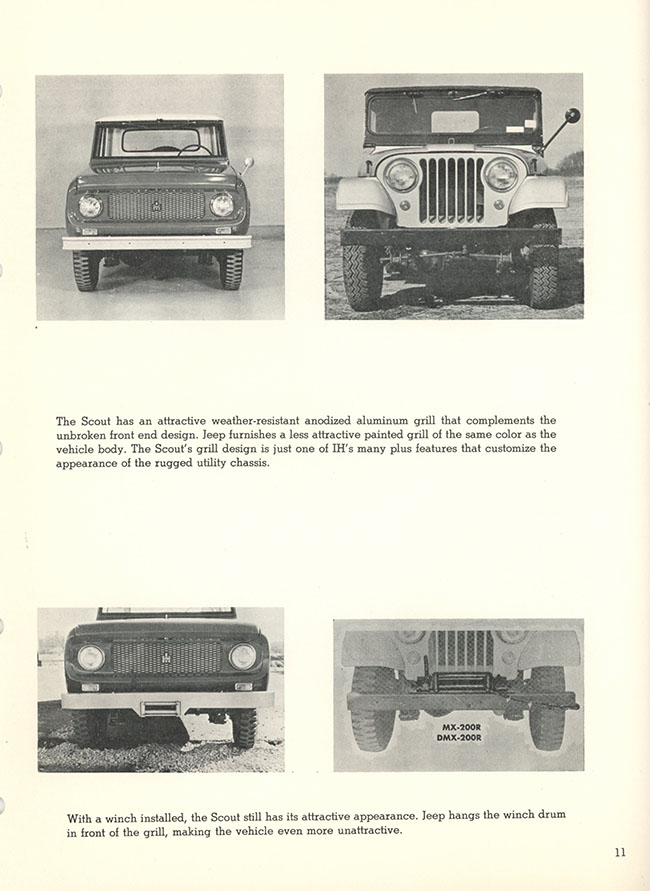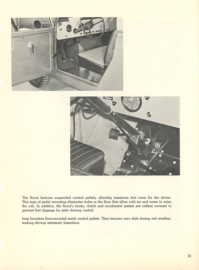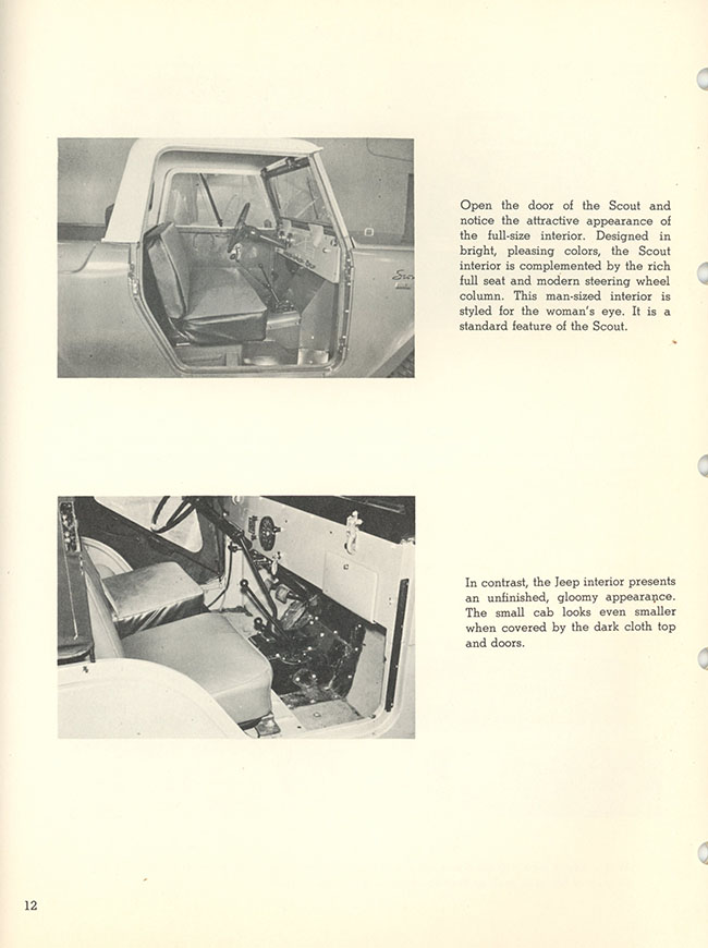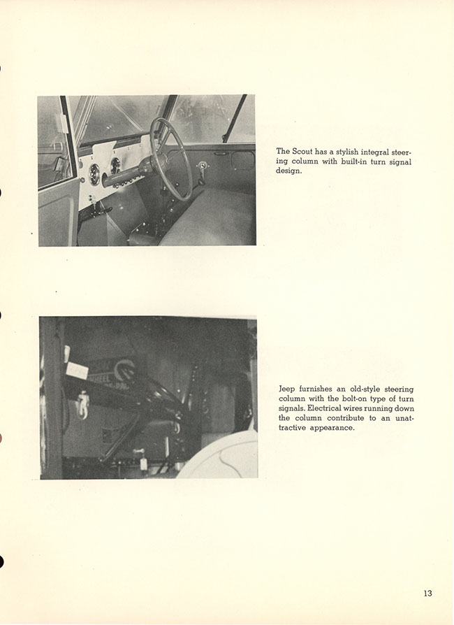 It is obviously biased toward the Scout, but it probably has better detailed photos of ’60’s era Jeeps than anything Kaiser-Willys used in its brochures. My favorite selling feature for the Scout is the dished steering wheel so that during an accident you won’t smash “the driver’s chest at one concentrated point” on the center column of the steering wheel like found in the Jeep (obviously a safety feature before seat belts were deemed necessary.)