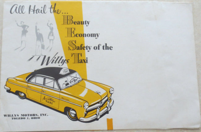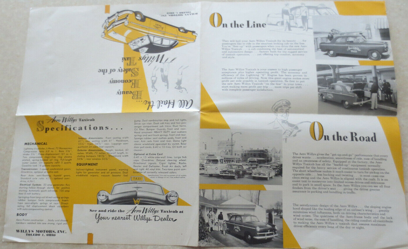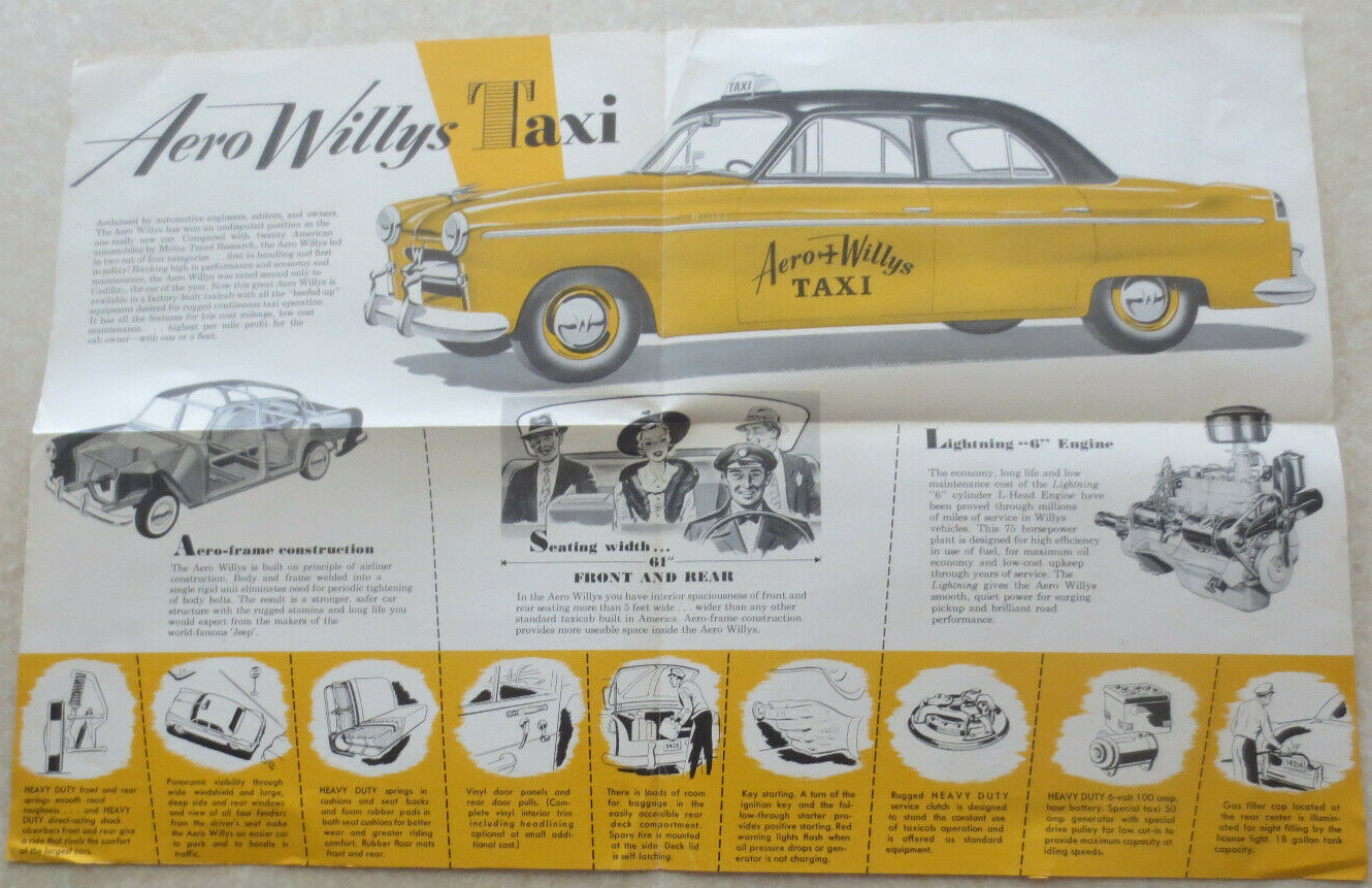 “An original 1950s Willys-Overland advertising brochure for the Willys Aero Taxi car. This interesting fold-out brochure describes the main features of this Willys Taxicab with a range of illustrations. It was published by Willys-Overland in Toledo Ohio in the USA.”
