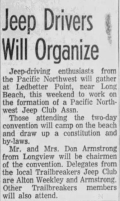 This August 1960 article in the Longview Daily News out of Longview, Washington, notes that the Armstrongs, members of the Trailbreakers Jeep Club, chaired the two-day convention that resulted in the formation of the Pacific Northwest Jeep Association (Iater changed in 1965 to the present-day PNW4WDA — Pacific Northwest 4-Wheel Drive Association). Note that the article refers to the association as the “Pacific Northwest Jeep Club Association”, but a decision must have been made to drop the word “Club” from the name. (some historical PNW4WDA info on the Webfooters page).