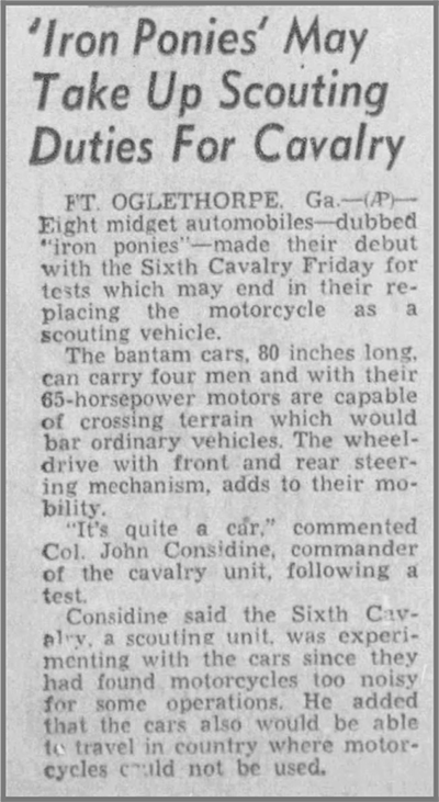 This December 22, 1940, article in the Birmingham News highlights the latest arrival of “midget automobiles” at Fort Oglethorpe, Georgia. I would imagine these are Bantam BRC-60s.