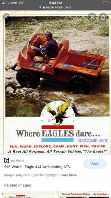 “This is a very rare amphibious ATV. They competed for the military contract against Coot. Coot eventually won the contract so eagle went by the wayside. I have restored about 90% of this and have put in a well running Vanguard. It needs some work still to be completely finished but I have lost Interest in being the one to finish it. It would be cool to finish it and use it as a river rig or take it to the sand pits and you should be able to just drive out on the water with it, that was always my goal. One sold on eBay a few years ago it was completely restored for 7500. I have not seen one for sale since then, I see coots on there all the time but they’re much more common. Make me an offer or I’m open to trades. Motorcycles, four-door with a long box or anything that I can take to the lake. Let me know what you got.”