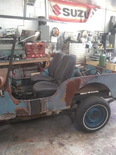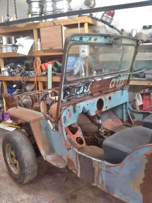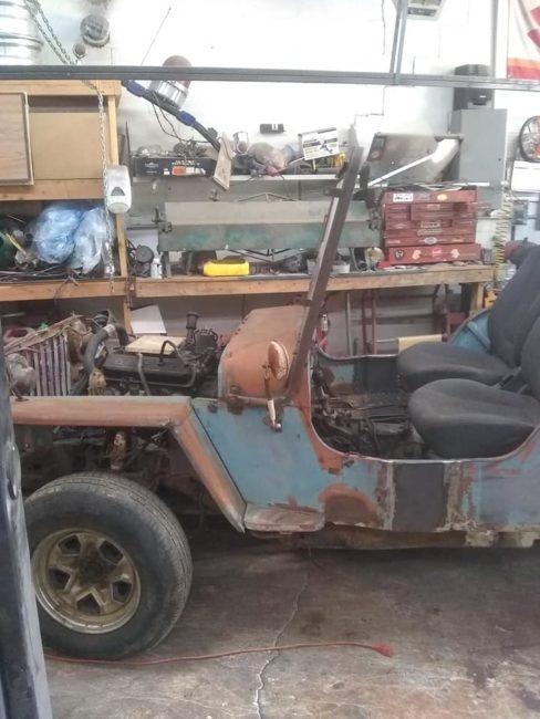 “Willy’s Jeep sitting on an S10 4 x 4 frame, 4.3 motor 700 trans. This is a project that needs to be finished for sale or trade”
