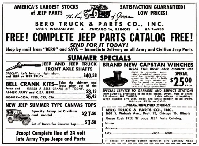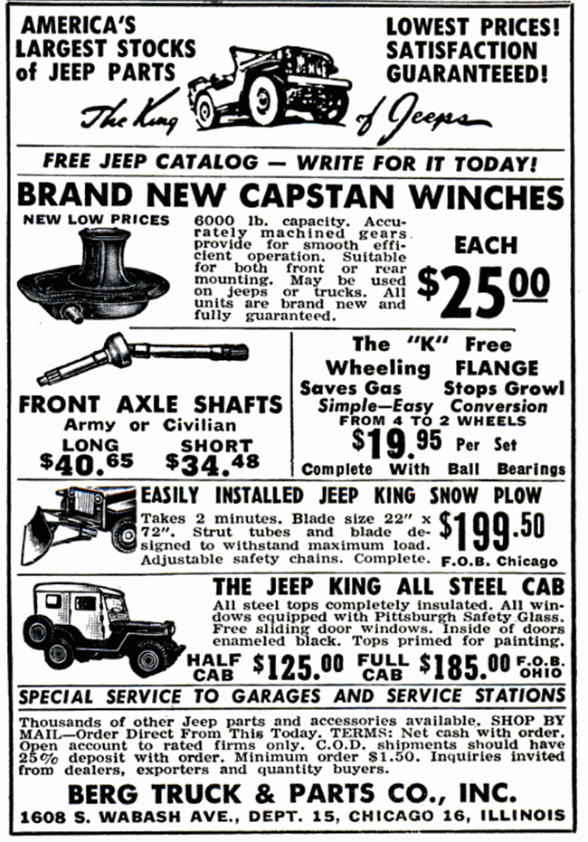 A November 1955 ad highlighted the use of private labeling by Berg. The hardtop looks like a Worman Jee-Cab that’s been rebranded “the Jeep King All Steel Cab”. I’m sure the “Jeep King Snow Plow” is another private labeled product.