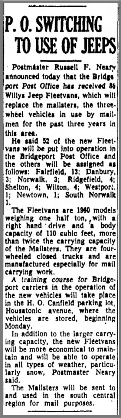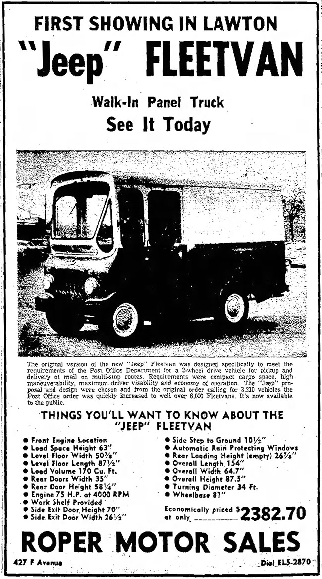 NJ post offices had few of these, Mailmen were still using their personal cars to walk their routes. I only remember the Paterson, NJ Post Office having the FJ3’s in their fleet. The newsdealer I worked for in the 1960’s had 2 FJ3A delivery vans (left hand Drive) what a blast to drive, cut down on delivery time, seating height, sliding windows & doors along with compact design made the Fleetvan the perfect delivery vehicle. P/S The stick shift was positioned somewhat behind the driver’s seat, very long with a long throw, made it fun to drive. You needed to be careful going around corners, would tip to one side, on more than one occasion, I lost a helper when he slid out the open door when going around a corner.