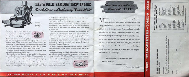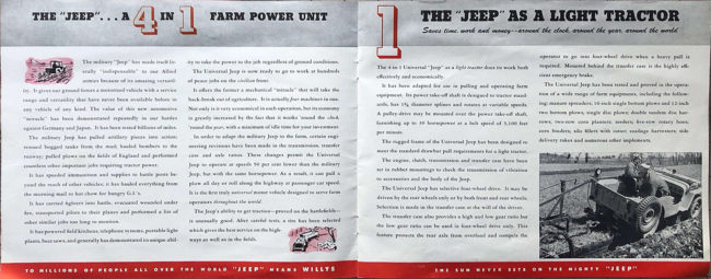 That was a very important brochure as a part of civilian Jeep history. If you look closely at the cover, the sign on the wall behind the post says OAKLAND COUNTY FAIR. 22 years ago I matched that picture to a Bar on Grand River Ave in New Hudson, across the street from the church shown in the AGRIJEEP films.