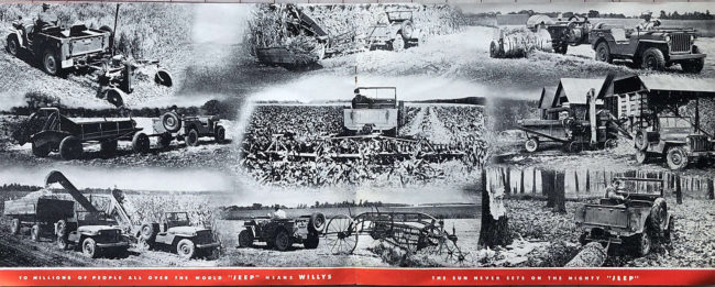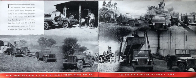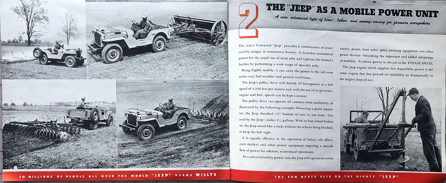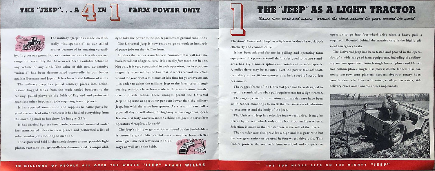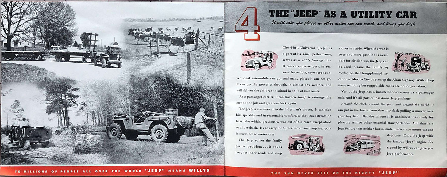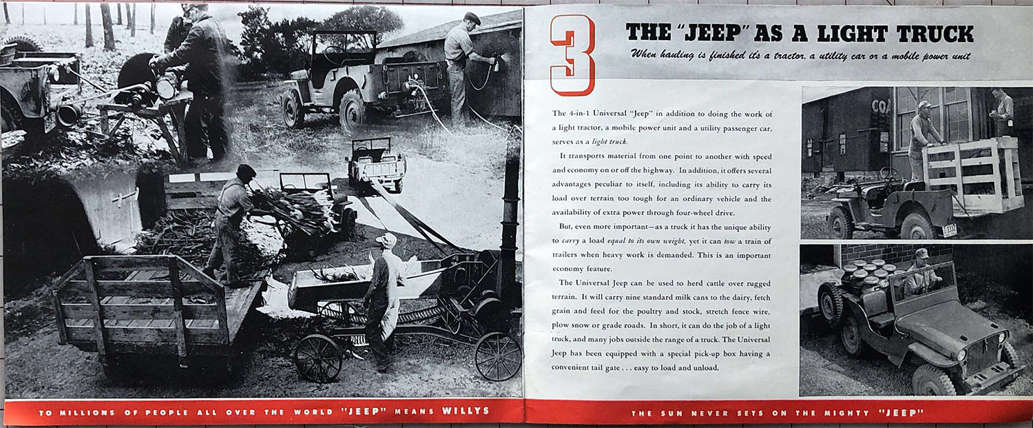 I finally snagged one of these ‘Jeep’ Planning brochures. Based on some of the images (like the WILLYS and JEEP within a link), I’d say this was produced in the Fall of 1944. As best as I can tell, it might be the earliest brochure for what would be the CJ-2A, though you’ll note that only CJ-2s are pictured (unless I missed an X-cj). The brochure breaks down the four principal uses for the “peace time jeep”.