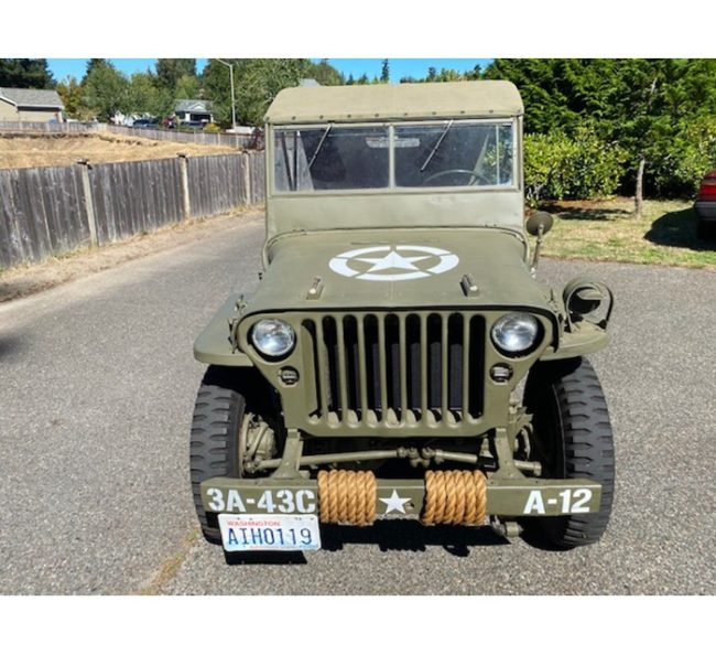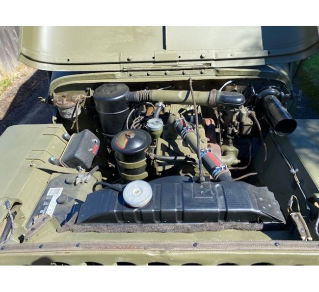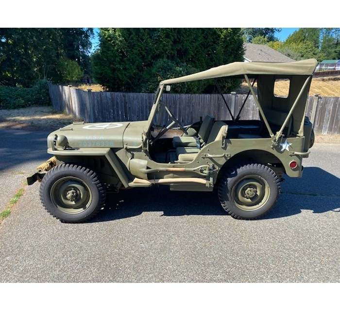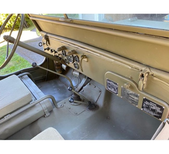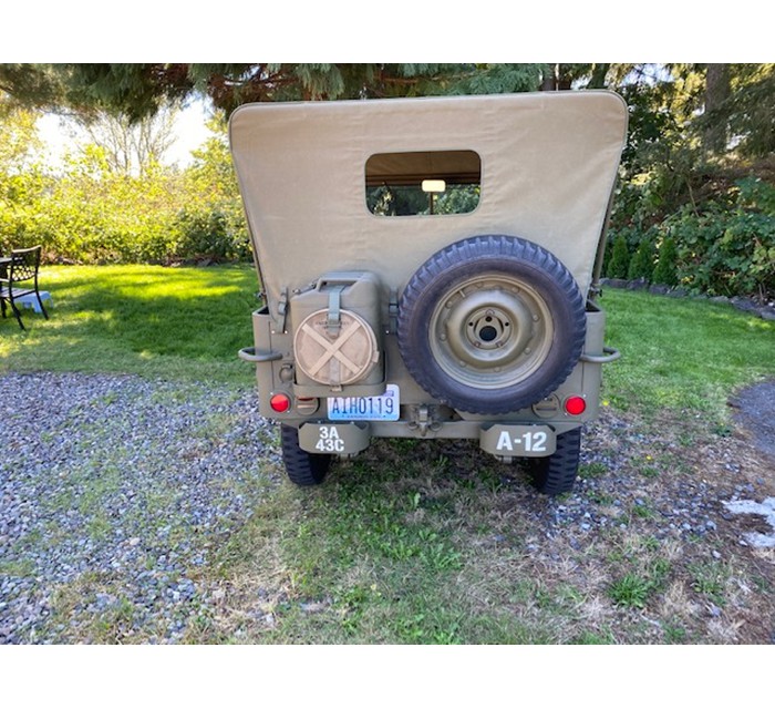 “Date of delivery 10/29/43. Original body and tub. Original engine, transmission and running gear. 6 volt system. Matching data plate and frame numbers. Beachwood canvas. 4 new Goodyear S3 military tires with original Goodyear spare tire. All tires are mounted on combat rims. New wiring harness and gauges. Frame hat channels are in good condition. Everything works well including service lights, blackout lights, horn, gauges, toolbox locks, etc. Accessories include 1942 M1 rifle scabbard. I have owned the Jeep for 8 years and it has always been dependable and runs great.”