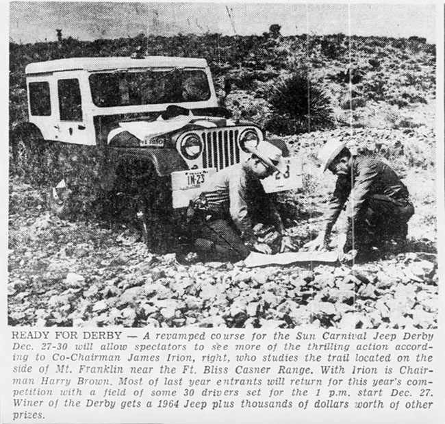 In the autumn of 1962, the Sun Carnival organization in El Paso, Texas, decided to add the Sun Carnival Jeep Derby, one of only four derby’s held in the US, to it’s late December events calendar (the other ‘derbies’ were held in Las Cruces, Truth or Consequences, and Denver). The grand prize was a brand new 1963 CJ-5 donated by the Willys Manufacturing Company (I think they meant Willys Motors).