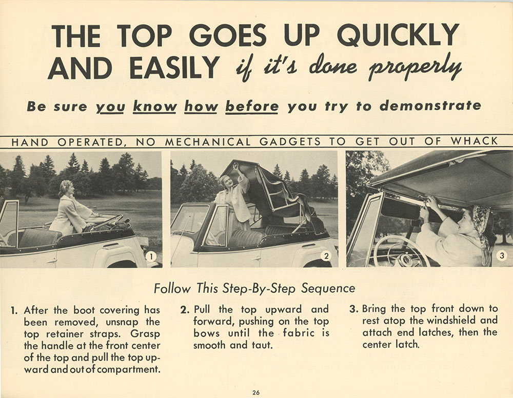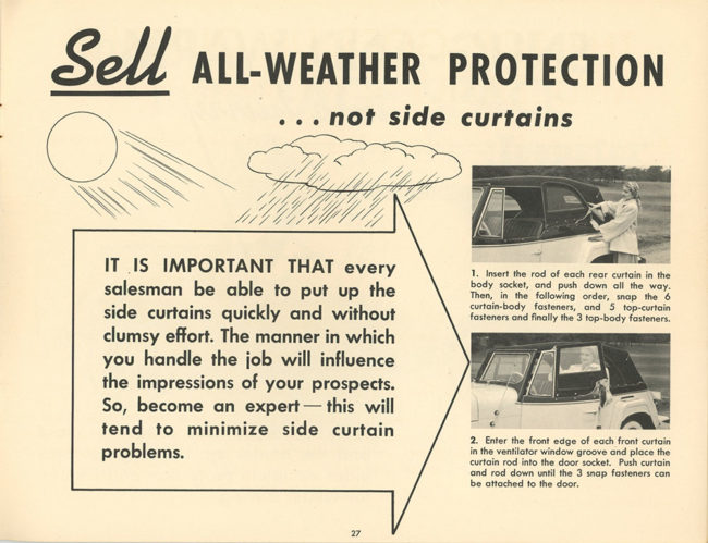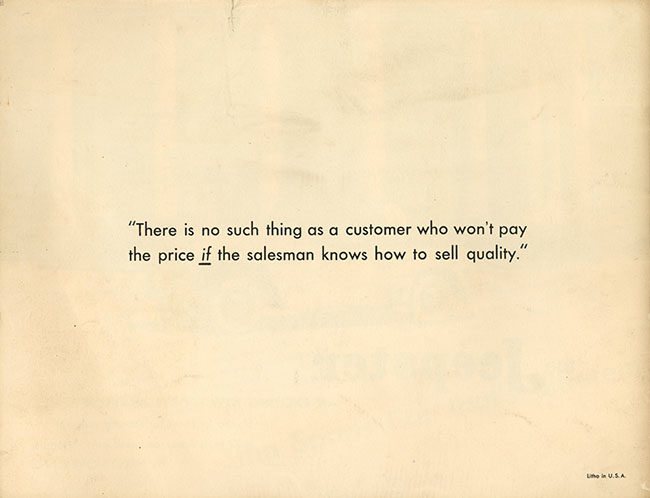 The last page states “There is no such thing as a customer who won’t pay the price If the salesman knows how to sell quality”. This sales promotion must of had a long term effect on the sales staff. Having been printed sometime in the late 1940’s 1950, this frame of thought lasted well into the late 1960’s when I was shopping around for a new Jeepster Commando. When my friend “Bruce the Moose” spotted the sticker price on a bright red Jeepster convertible ( excuse me, PHAETOM) and asked the sales man, who is going to pay that price? the Mide Motors salesman replied, ” There’s an