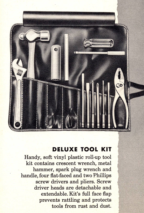 Claus is hoping to reproduce a leather kit version of this vinyl plastic tool holder and needs to see the inscription on the front of it. Here’s the back side (from the 1949 Willys Accessories Book):