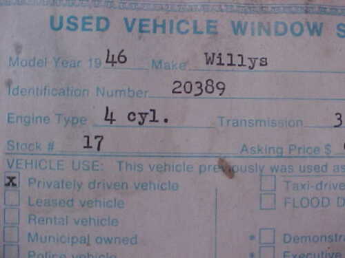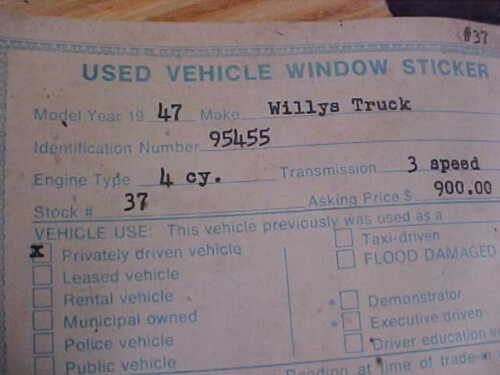 “MY FRIEND BOUGHT OUT AN OLD WILLY’S DEALER MANY YEARS AGO–IT WAS CALLED “BIG ED’S” IN SHEBOYGAN, WI.  THESE ARE SOME OF THE ORIGINAL TAGS THAT WERE HUNG ON THE WILLY’S JEEPS FOR SALE.  THESE ARE KIND OF COOL FOR THE COLLECTOR.  THERE IS A 46, 50, 46, 47, 41″