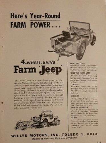 “1954 Willys 4 wheel Drive Farm Jeep AD, taken from a 1954 magazine. AD measures about 5 x 8. Condition is Good with some discoloration from age.”