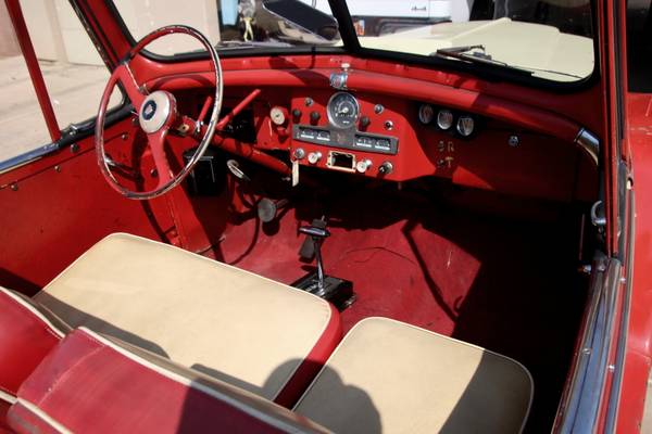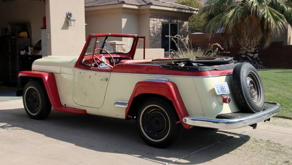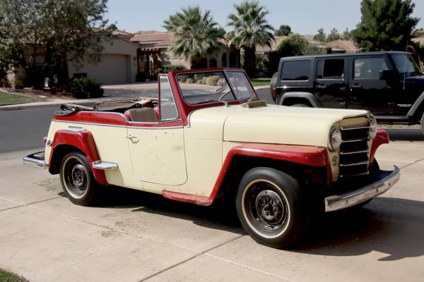 “This very rare 1950 Willys Jeepster is one of only 5,845 cars built this year. A total of 19,132 Jeepsters were ever made in the years 1948, 1949, and 1950. Compare that to the one year numbers of the 1965 Mustang at 559,451 cars, and you can see just how rare they are. This one is a real Unicorn, because it has zero cancer anywhere I have looked. The areas where they typically rust are just beautiful. The power is from a more modern Ford; it is a 2.3 Liter overhead cam engine that runs very well, and has considerably more horsepower than the original Flathead 4, plus it has Electronic Ignition and a new 60 amp Alternator. The transmission is a freshly rebuilt C-4 3 speed automatic. The original fuel and amp gauge work great as do the aftermarket Oil, Water, and Amp Gauges. The top is in decent condition; just needs a window sewn in. No side curtains, but they are easy to come by. To be a 35K show car it will need new paint and some work done to it, but you can drive it home as it is! This is a real bargain at 8500.”