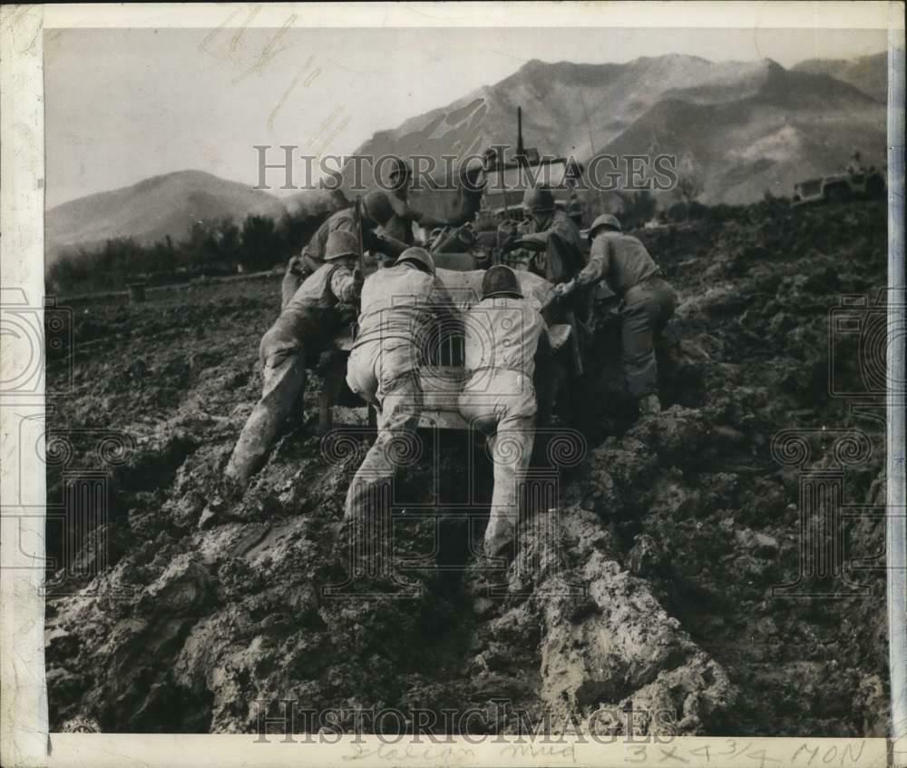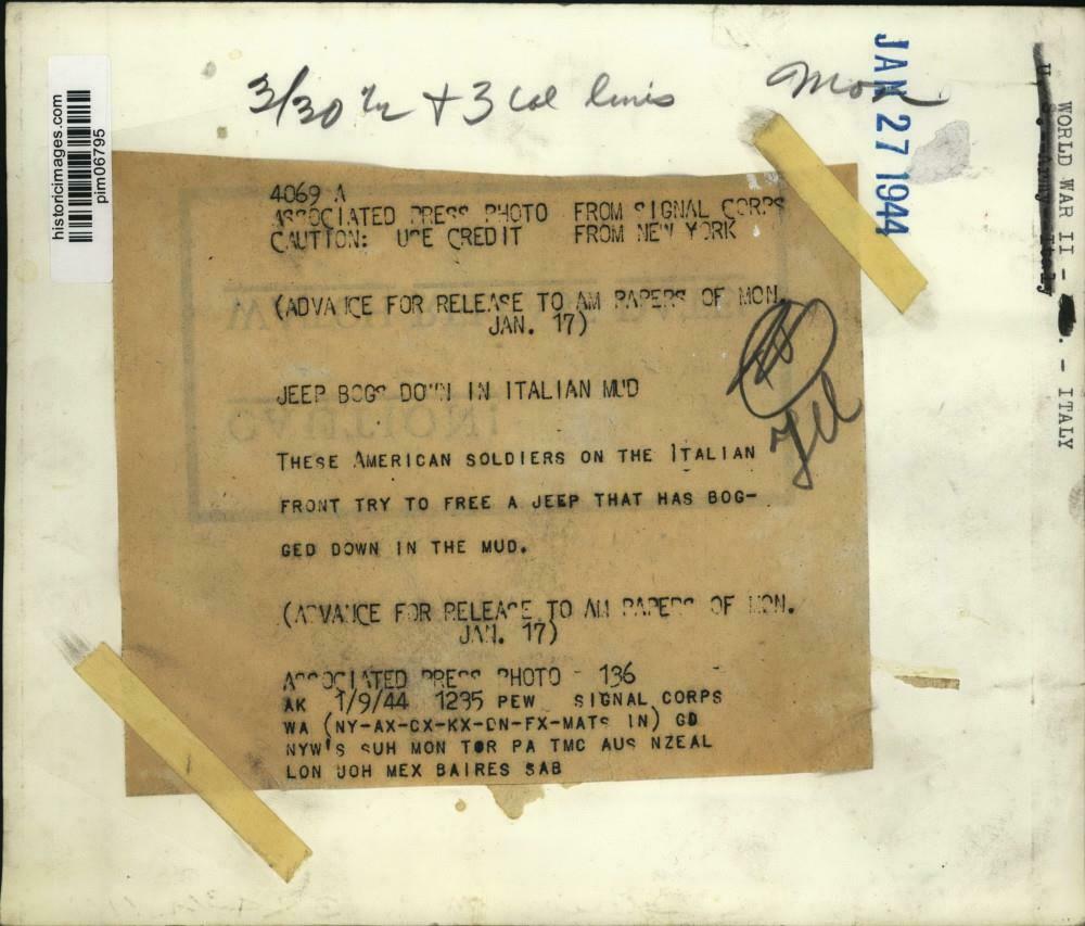“1944 Press Photo World War II US troops push an Army Jeep out of mud in Italy This is an original press photo. World War II – Italy. These American soldiers on the Italian front try to free a jeep that has bogged down in the mud. Photo measures 8.75 x 7.25 inches. Photo is dated 1-9-1944. ”
