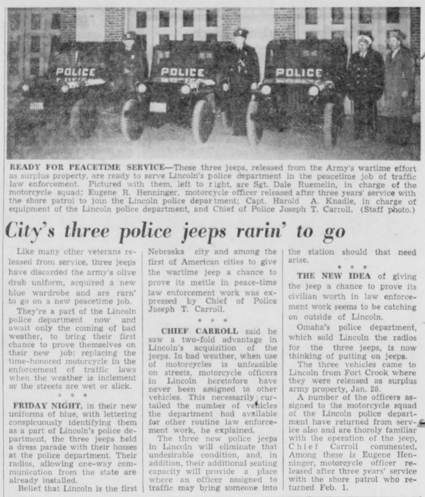 This February 9, 1946, article shares the news of the Lincoln, Nebraska, police department’s new surplus jeeps. These war surplus jeeps out of nearby Fort Crook were equipped with radios obtained from the Omaha police department.